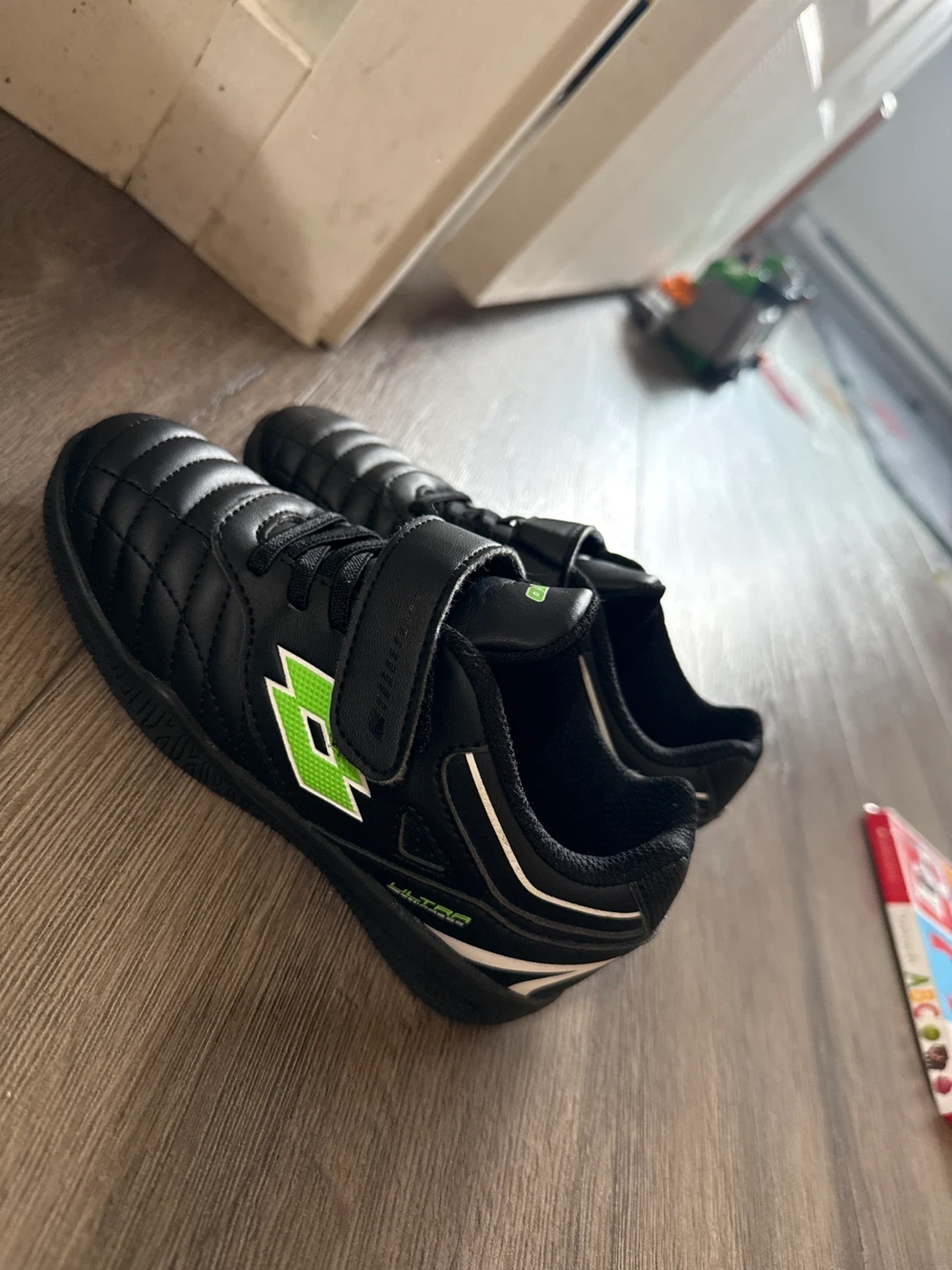 Selling a pair of black Lotto kids' indoor soccer shoes. They feature a green logo and a velcro strap for easy fastening. Perfect for your little soccer star!