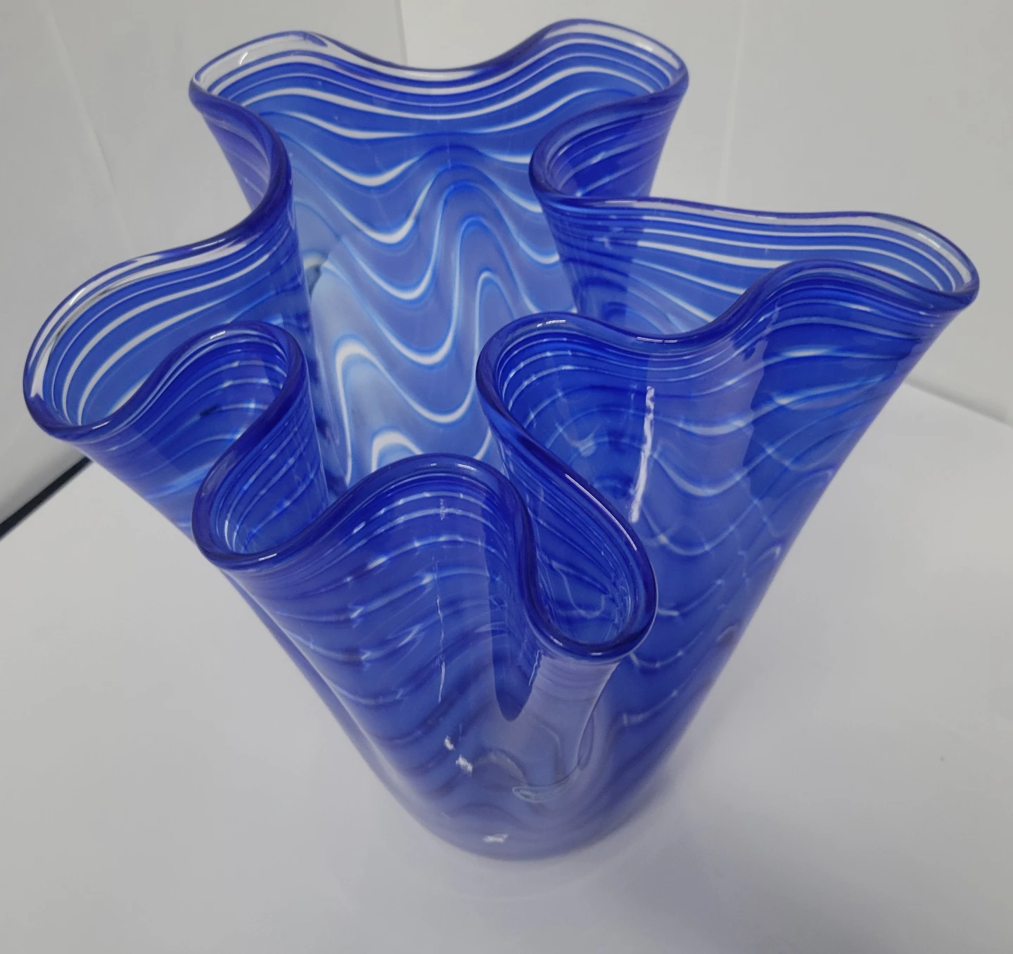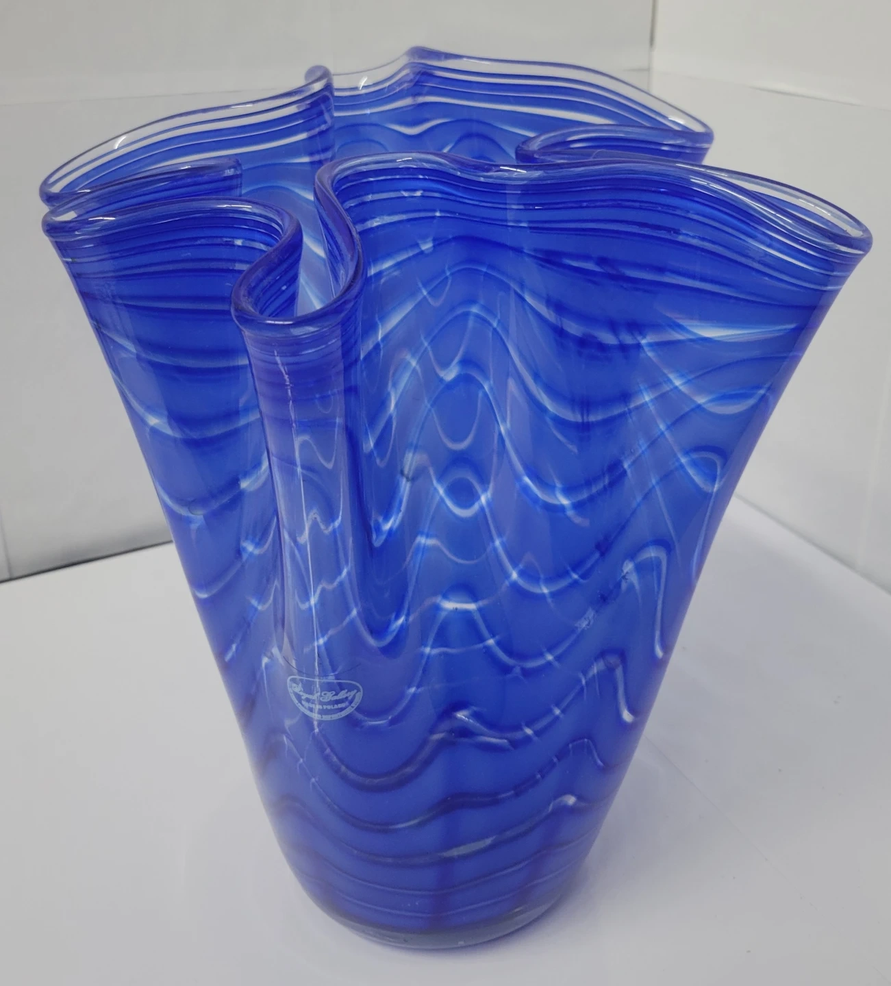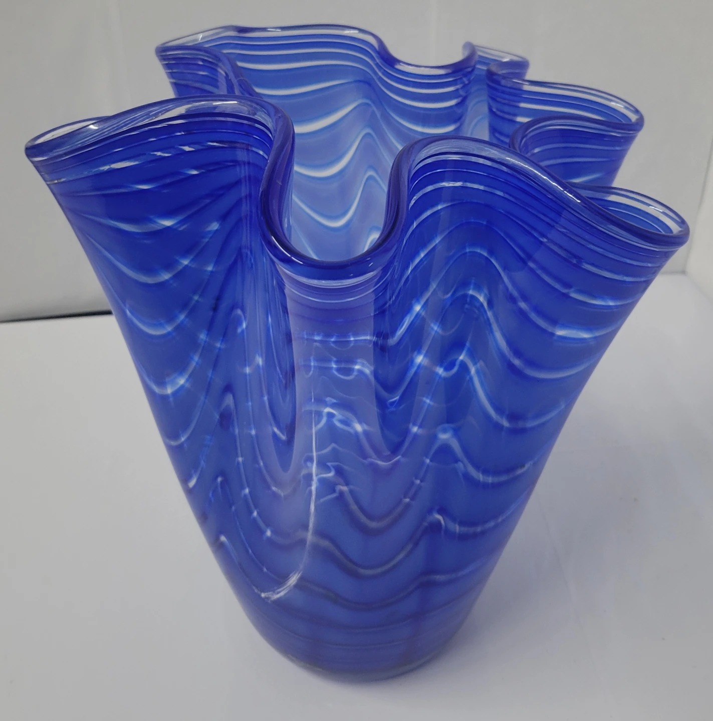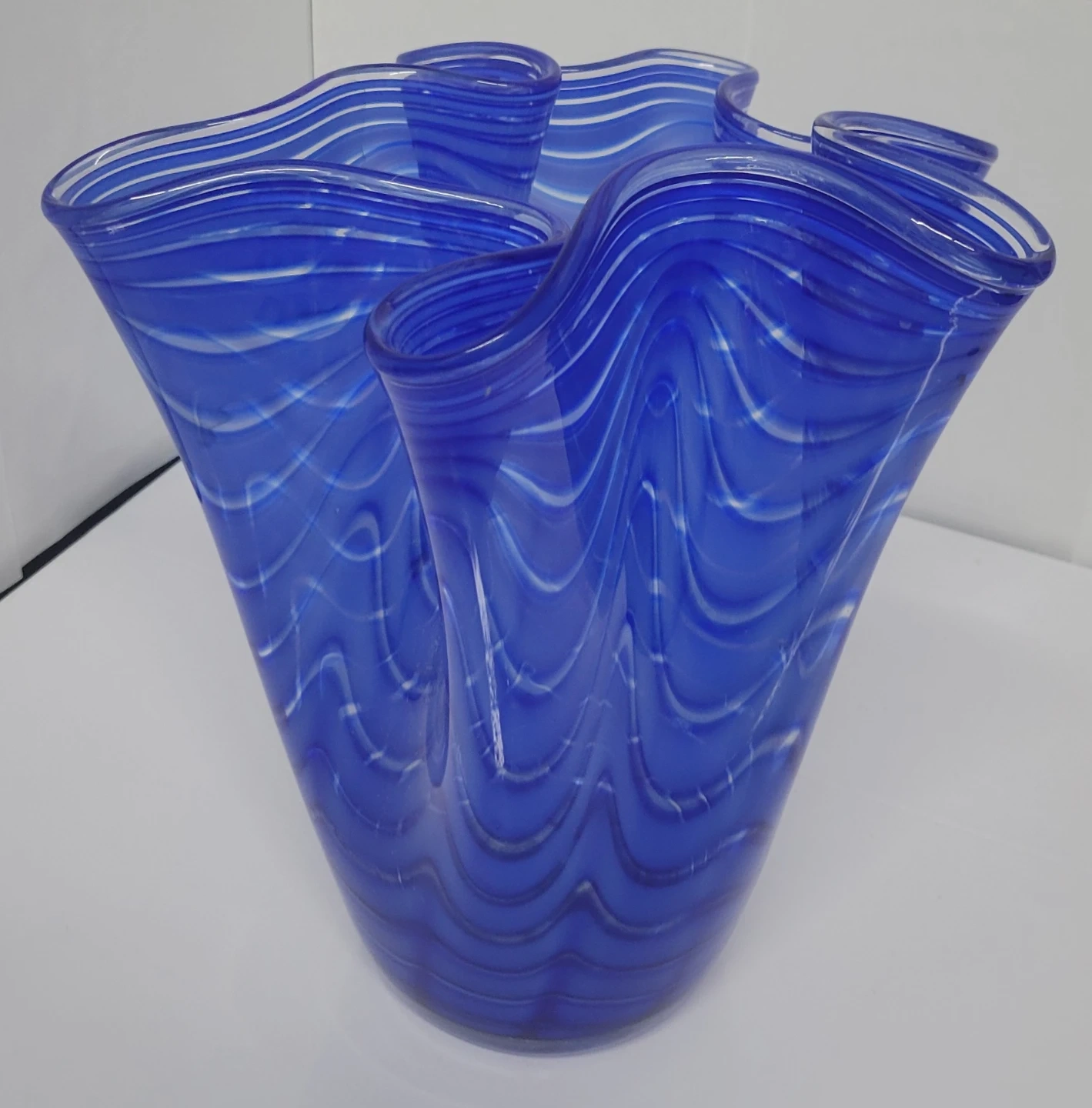 This is a beautiful blue glass vase by Royal Leerdam. It features a unique wavy design with white accents. It's in great condition and would be a lovely addition to any home decor! There is a minor chip on the bottom (see two last photos).