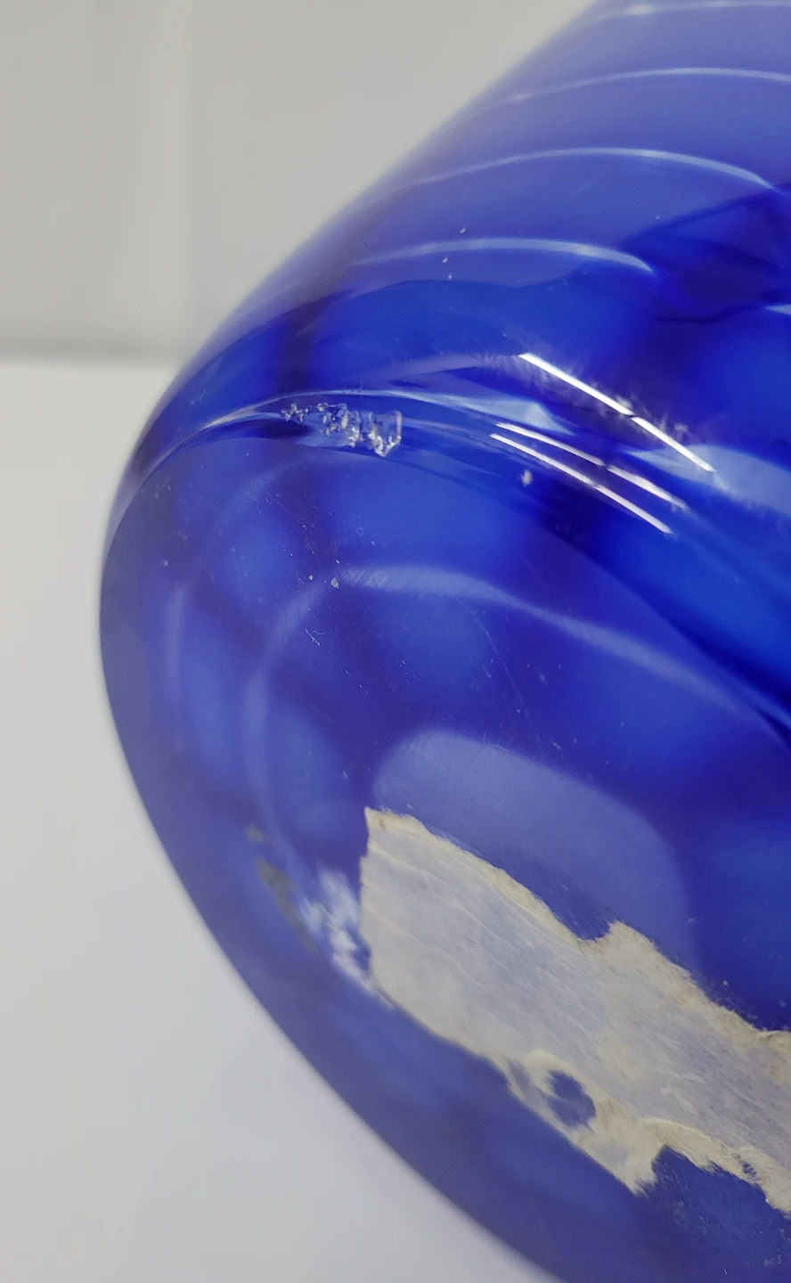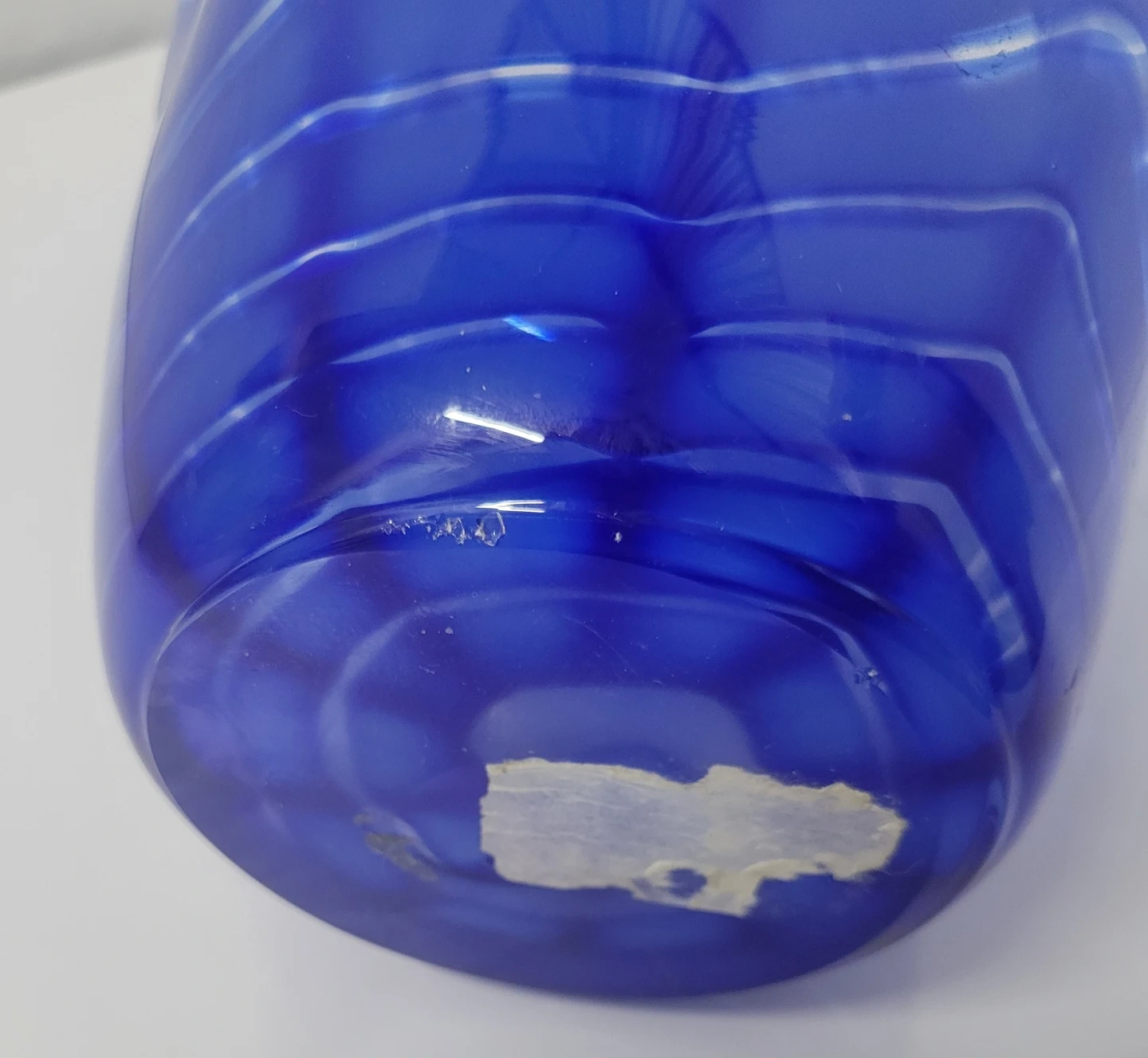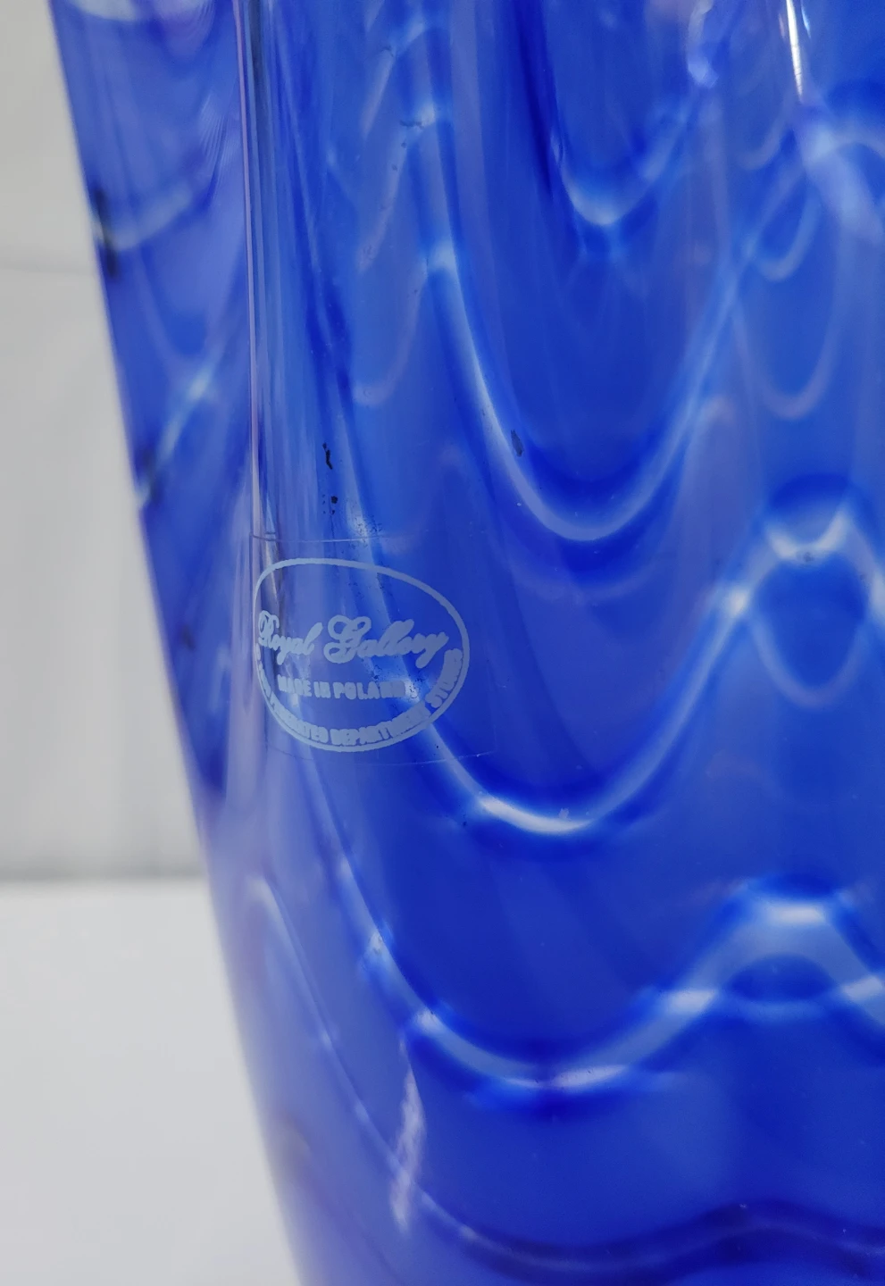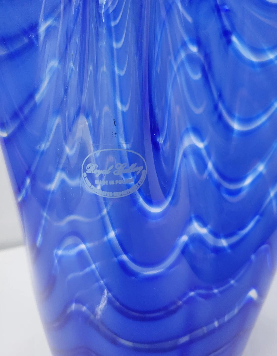 This is a beautiful blue glass vase by Royal Leerdam. It features a unique wavy design with white accents. It's in great condition and would be a lovely addition to any home decor! There is a minor chip on the bottom (see two last photos).