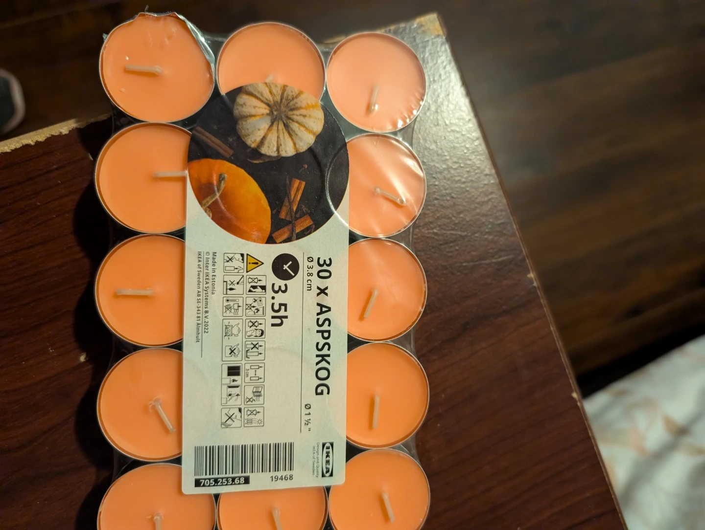 Selling a pack of 30 IKEA ASPSKOG tea lights! These candles each have a burn time of approximately 3.5 hours and are 3.8 cm in diameter. Perfect for creating a cozy atmosphere in your home
