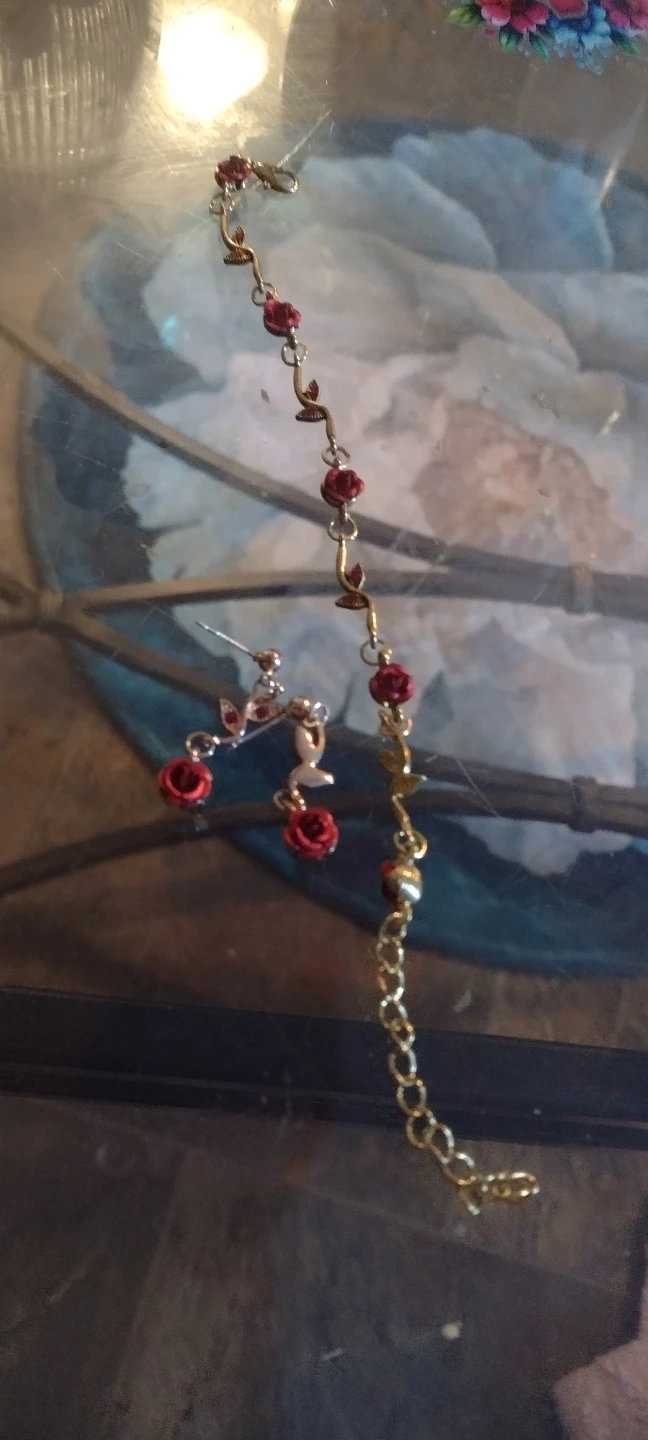 Here's a cute rose-themed bracelet and earring set. The bracelet has a gold-tone chain with little red rose accents and leaf details. The earrings match, with small red roses and leaf charms. It's a sweet and delicate set!