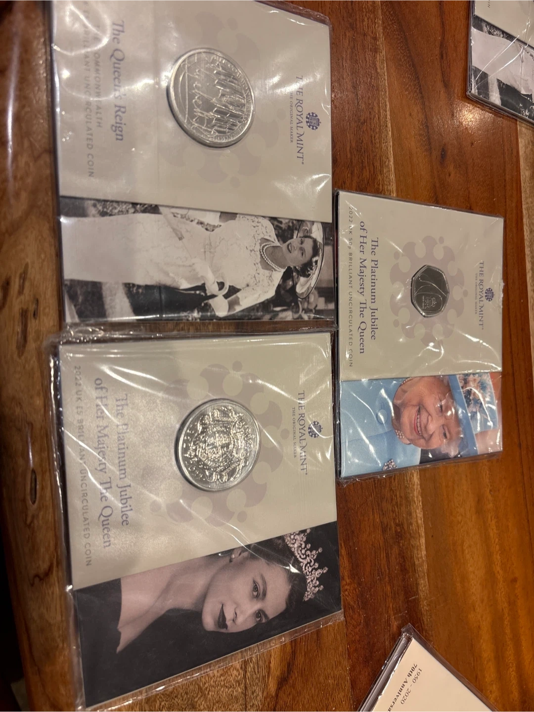 Selling a collection of Royal Mint coins, including The Platinum Jubilee of Her Majesty The Queen (2022 UK 50p and £5 Brilliant Uncirculated Coins) and The Queen's Reign (£5 Brilliant Uncirculated Coin). They are still sealed in their original packaging!