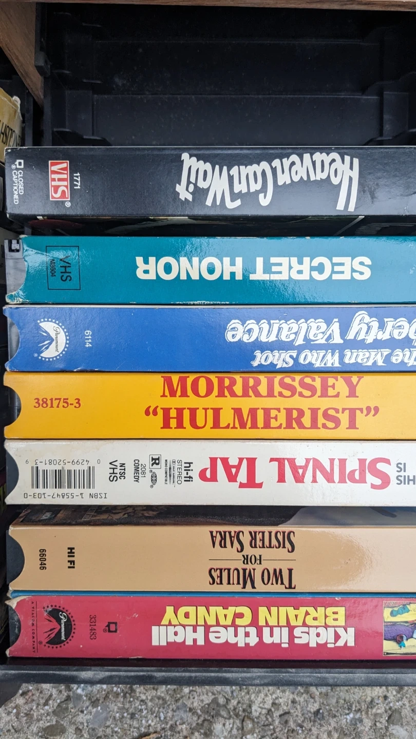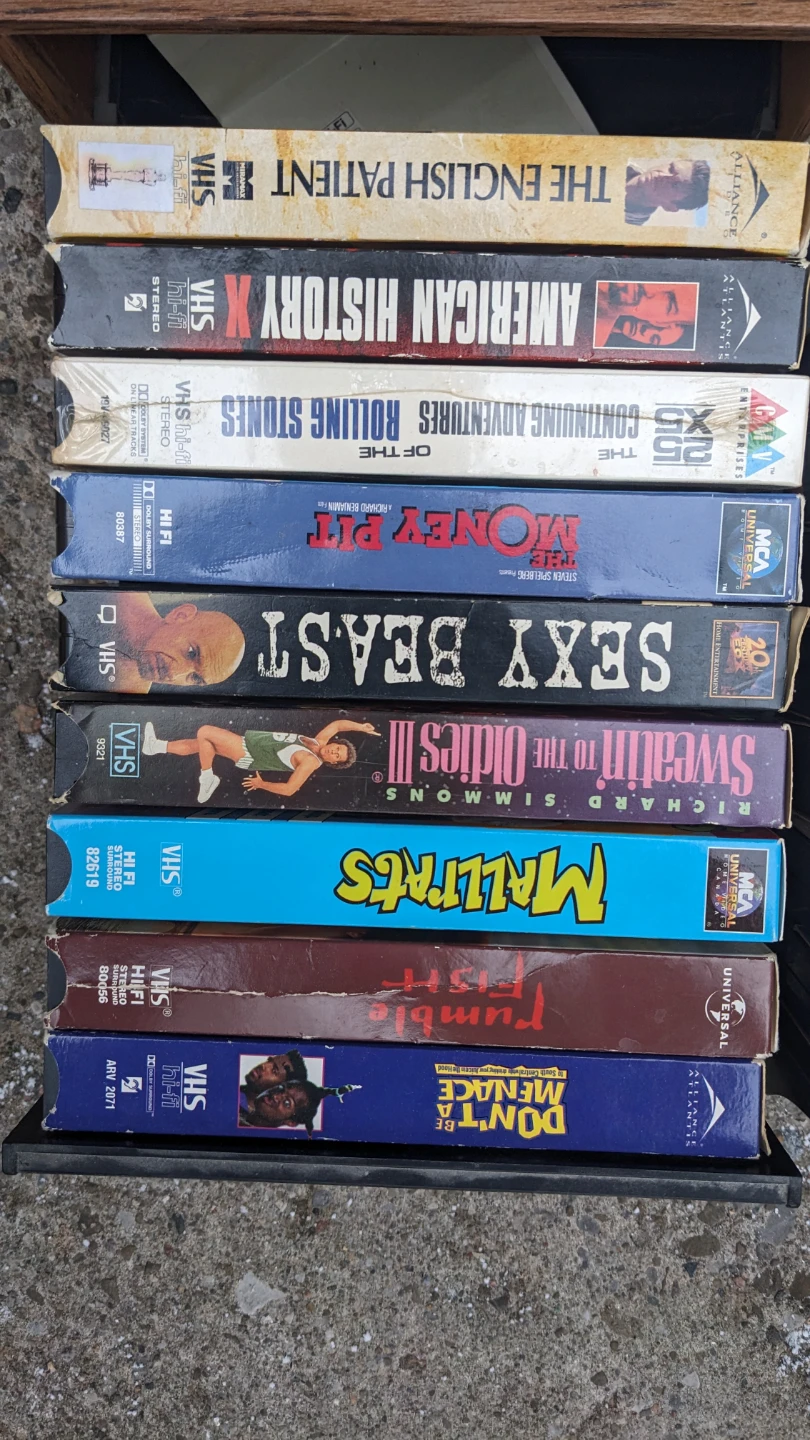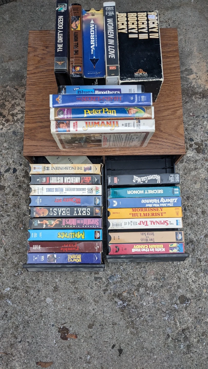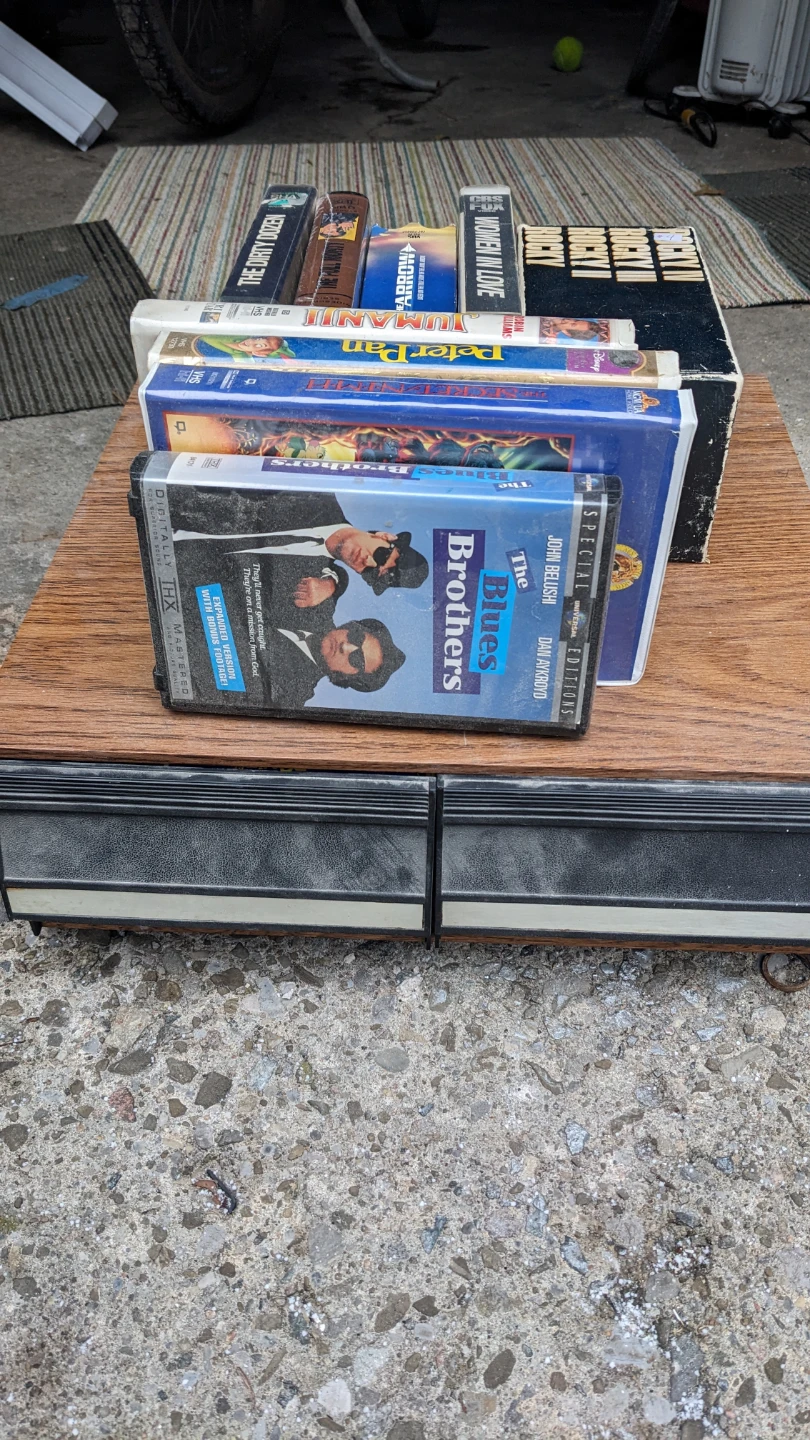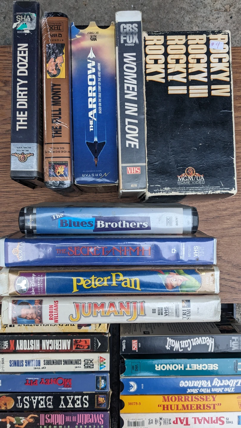 Selling a collection of VHS tapes with various movie titles. Great for collectors or anyone looking for a nostalgic trip back to the days of video rentals! Titles include The Dirty Dozen, The Blues Brothers, Peter Pan, Jumanji, and many more! Comes with case.