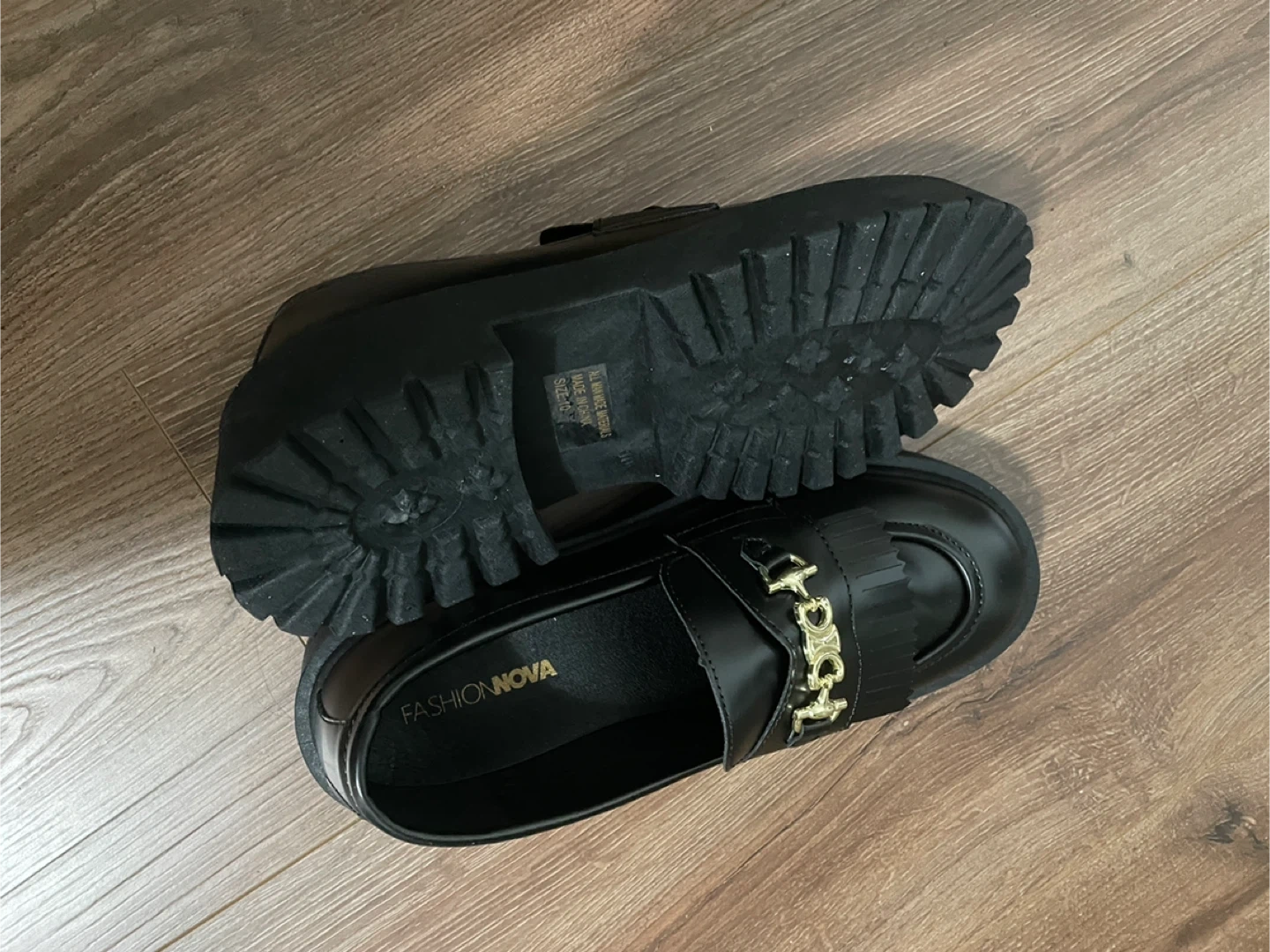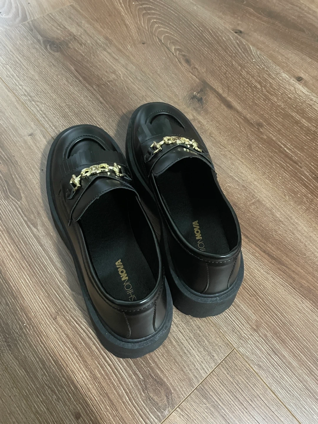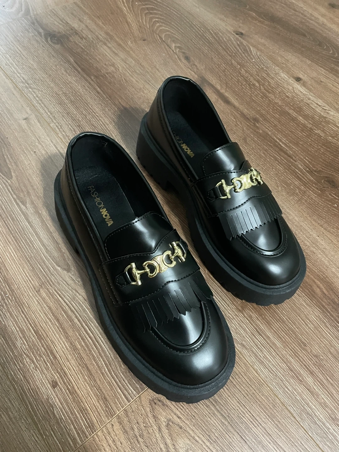 Selling a pair of Fashion Nova loafers in black. They have a gold-toned chain detail on the front. They are size 10 and in good condition, brand new!