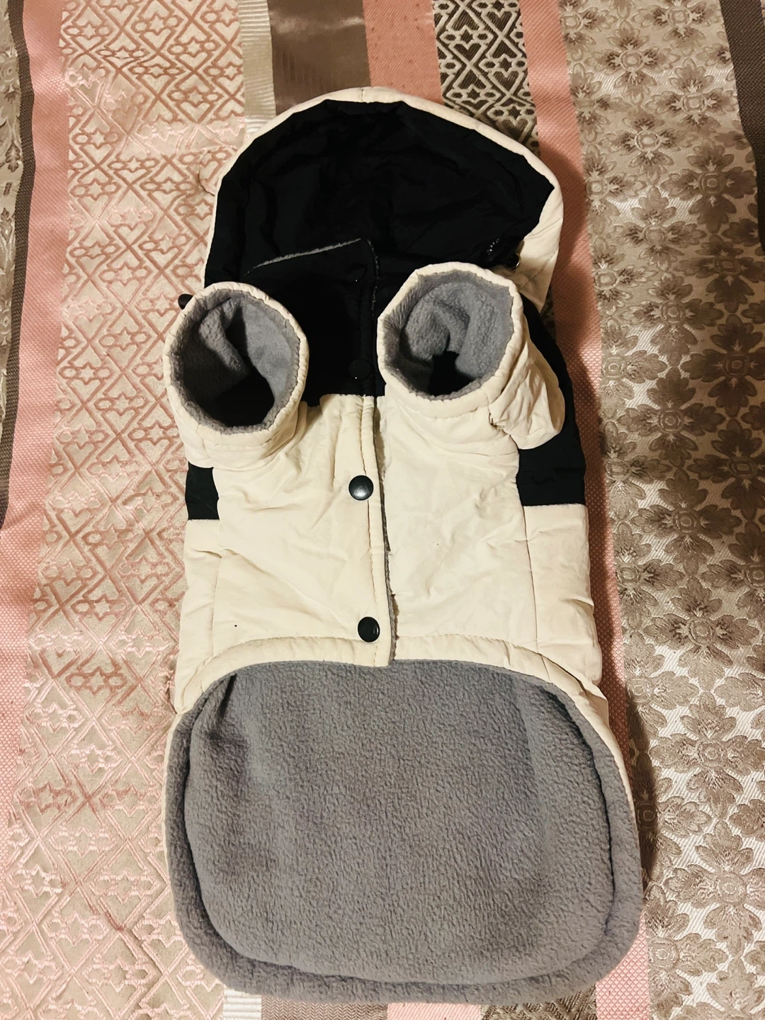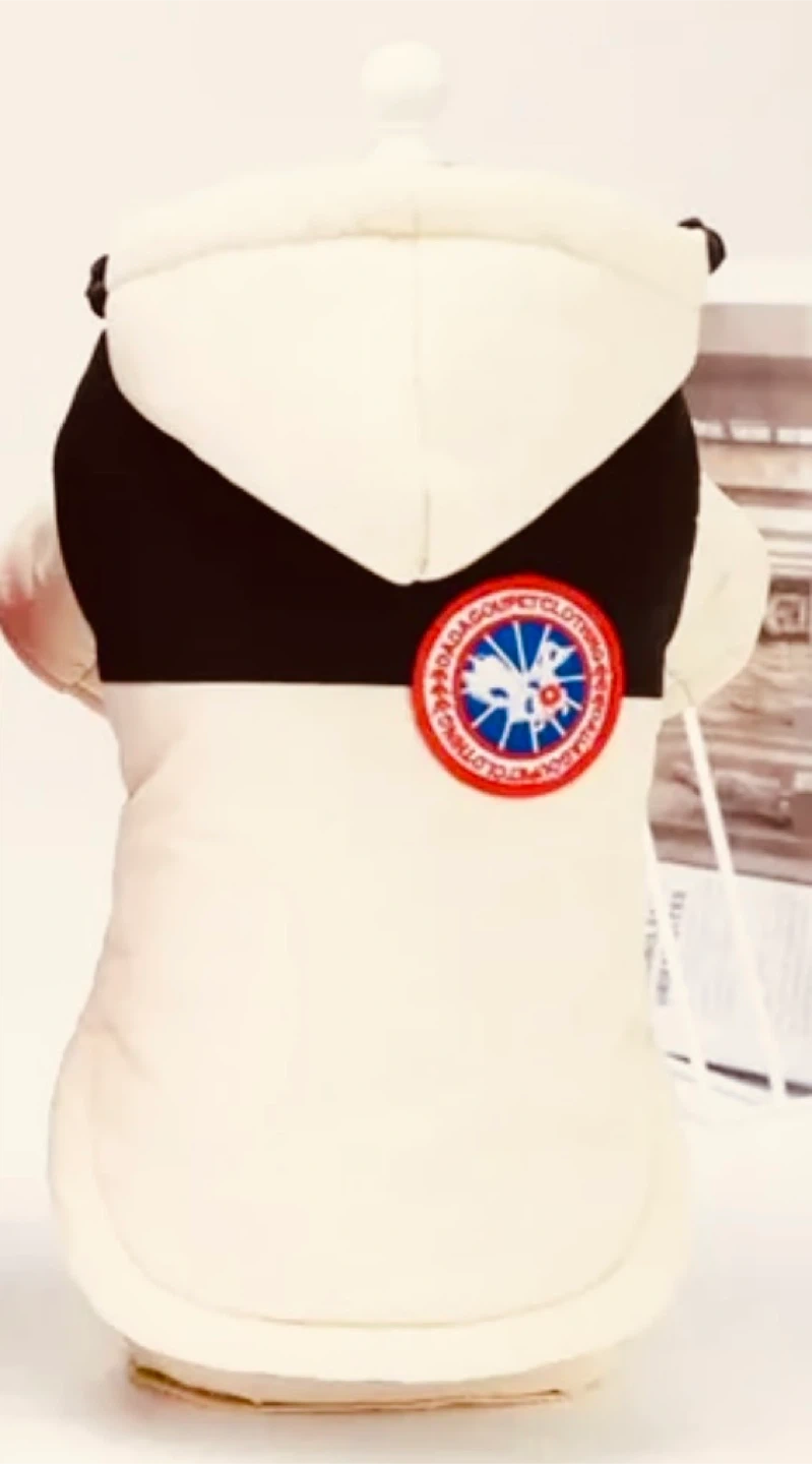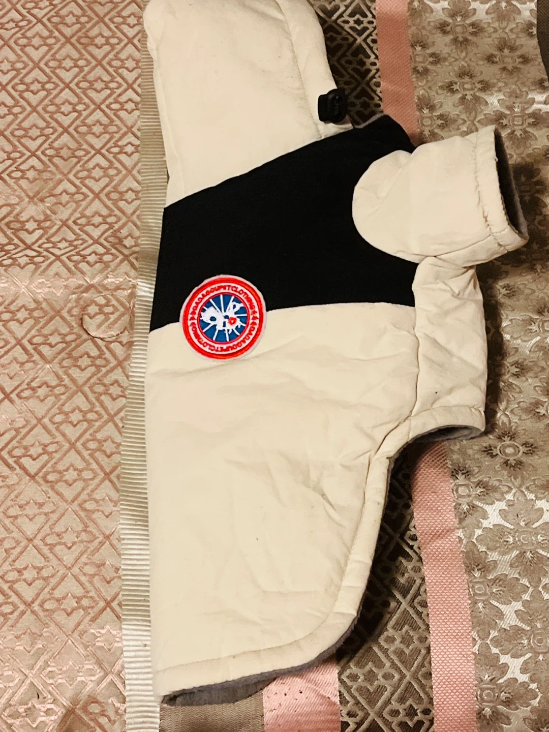 DaDa Goose inspired dog jacket. It's in great condition and ready for your furry friend! Colors beige, black and Red fleece insulated, water resistant, size large suitable for small breeds 11 to 20 pounds..