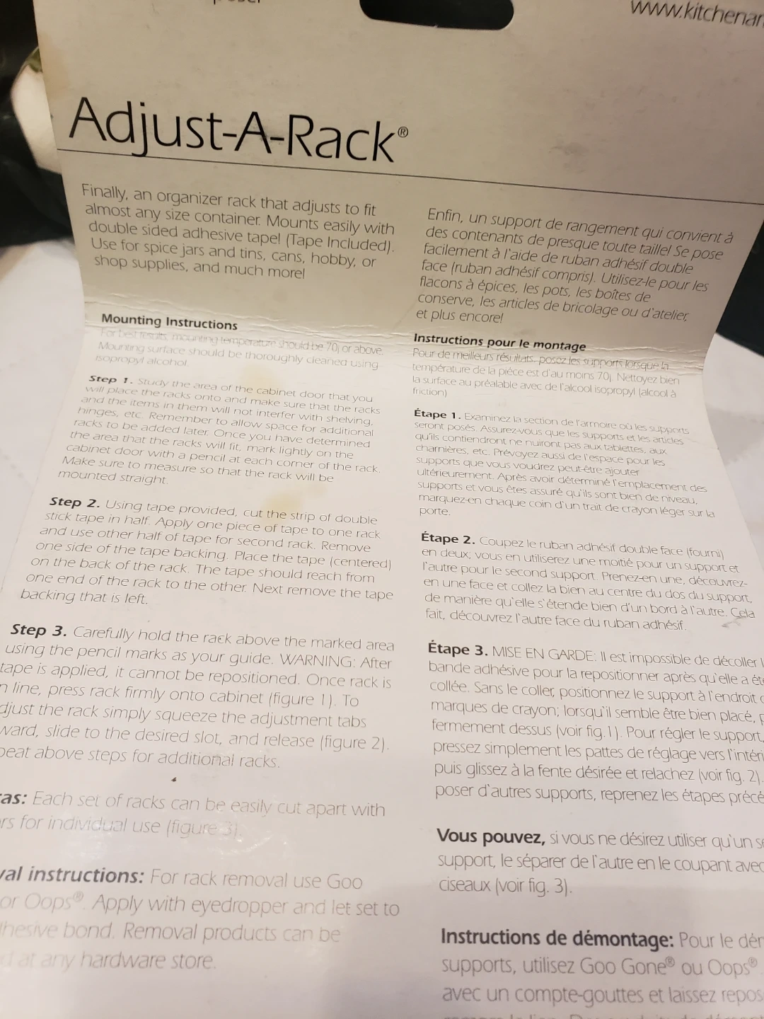 Selling a KitchenArt Adjust-A-Rack organizer system. It's an adjustable, easy-to-mount system that organizes 8 items. Great for spices, tins, cans, hobby, or shop supplies! Each rack can be easily cut apart with scissors for individual use