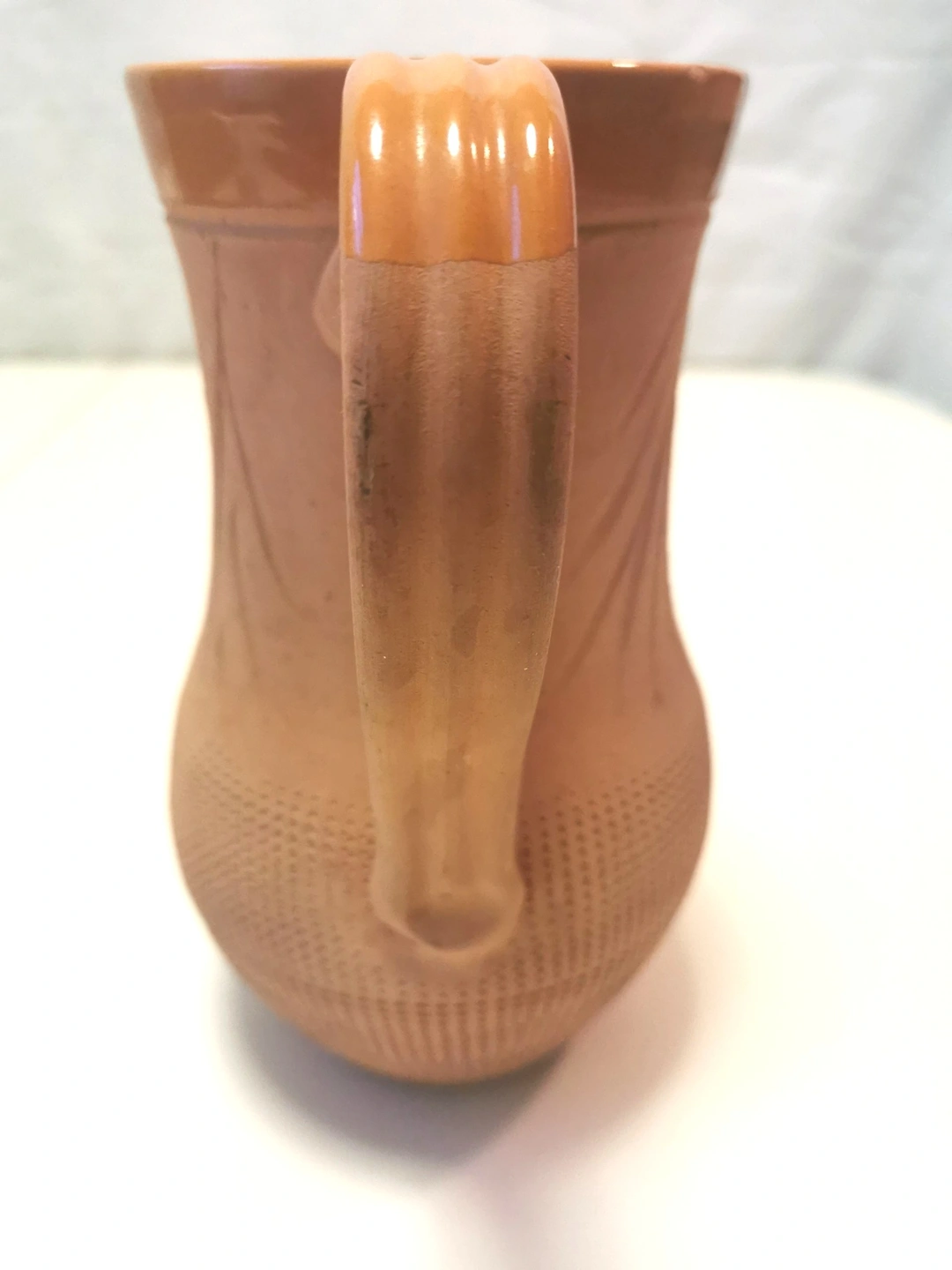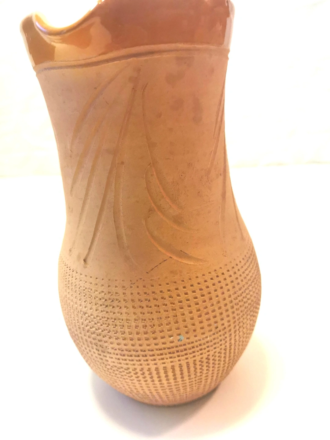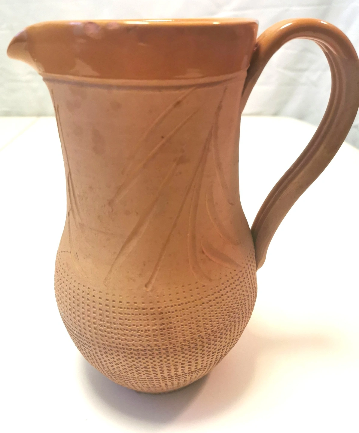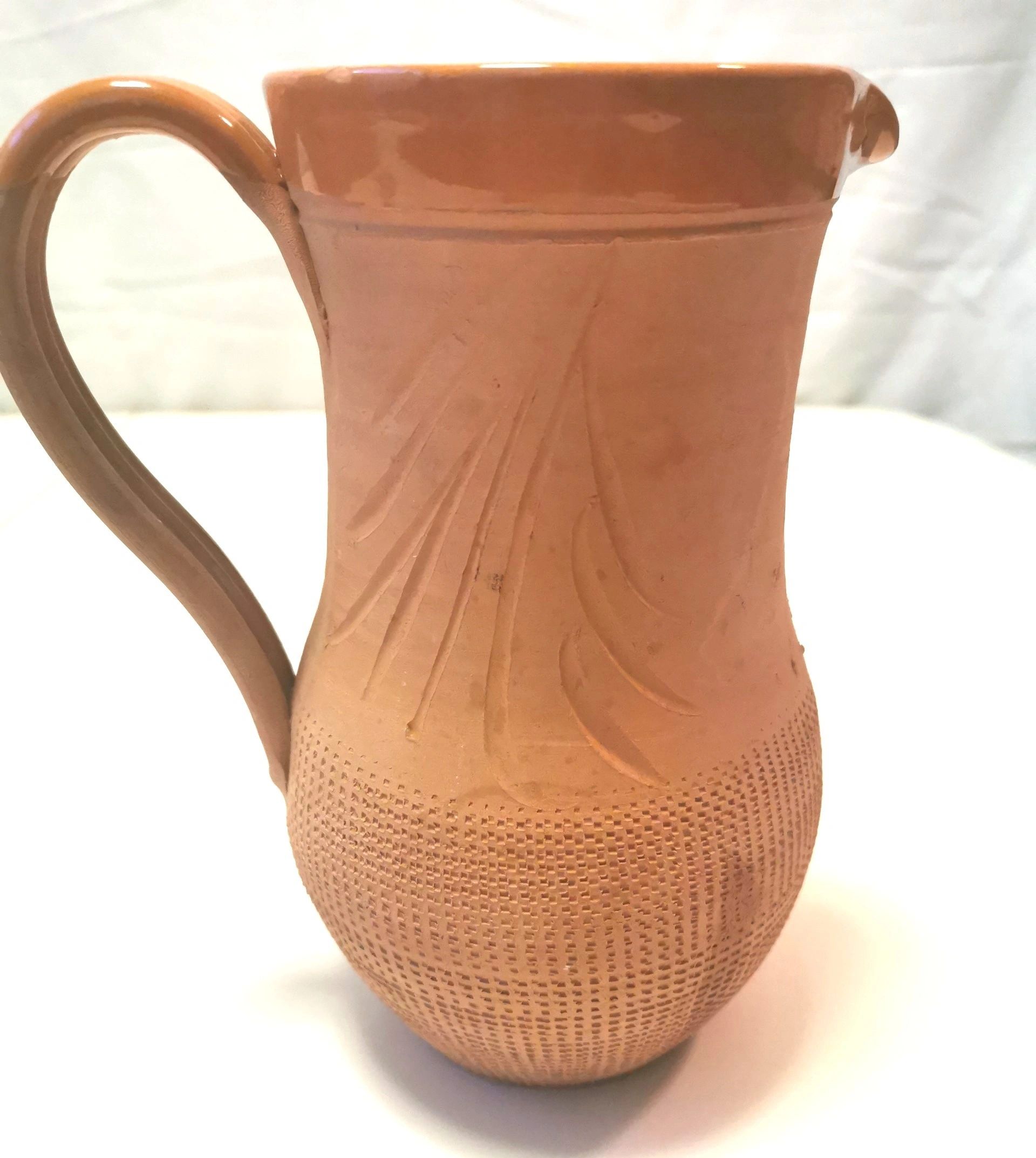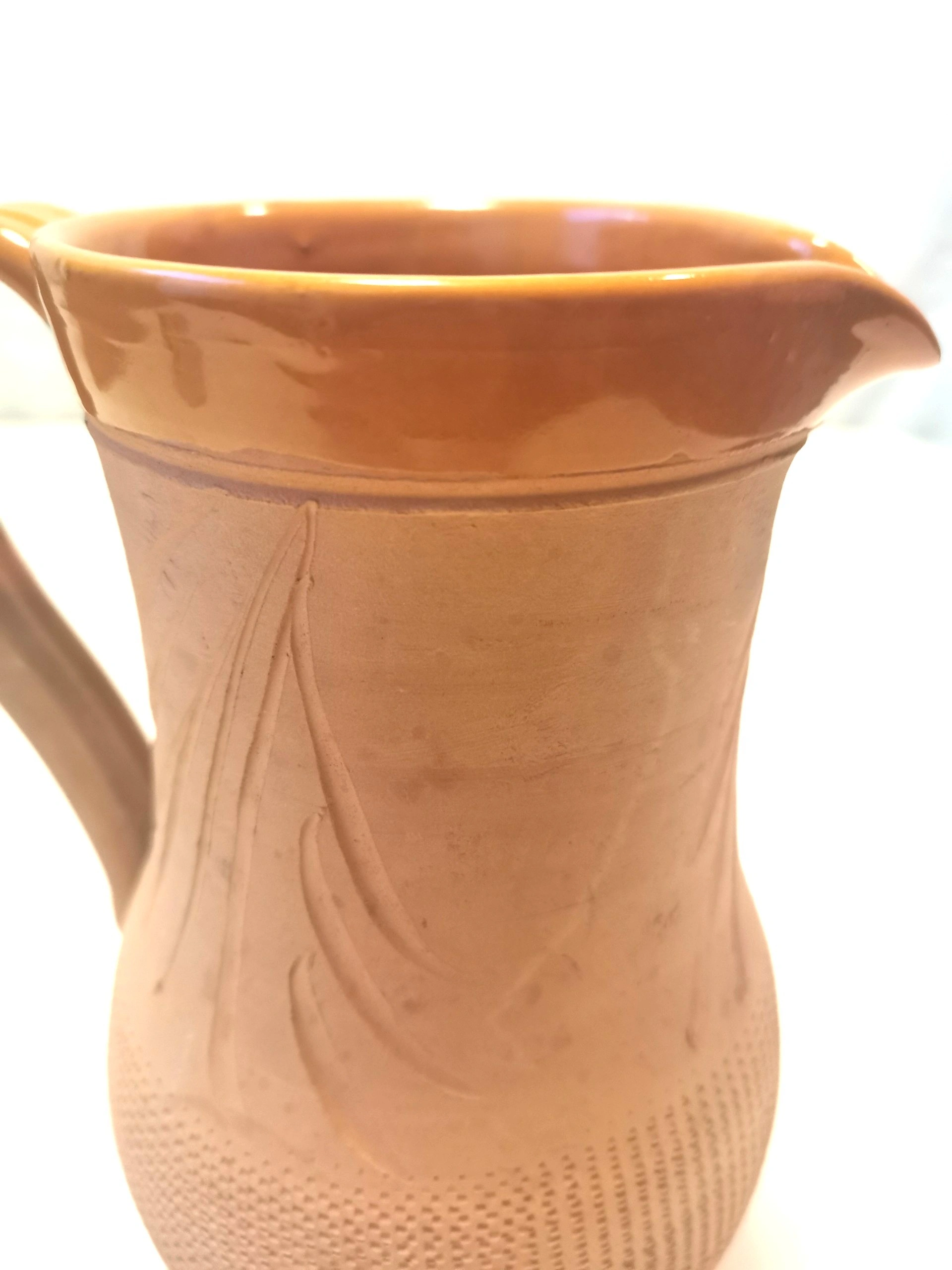 Texture: The lower third of the jug is decorated with a unique incised "waffle" or honeycomb texture, providing a wonderful tactile contrast to the smooth upper portion.