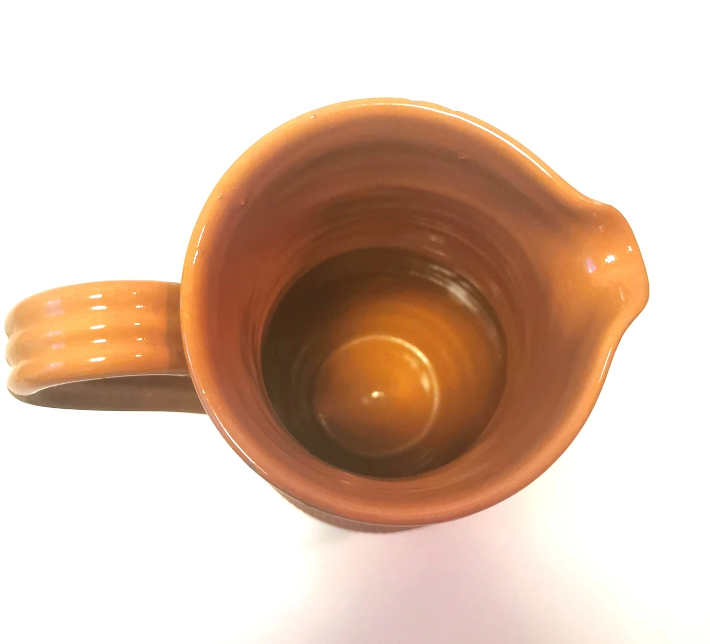 Glaze: The rim, interior, and handle are finished in a vibrant, high-gloss burnt orange glaze, which beautifully complements the matte, unglazed terracotta body.