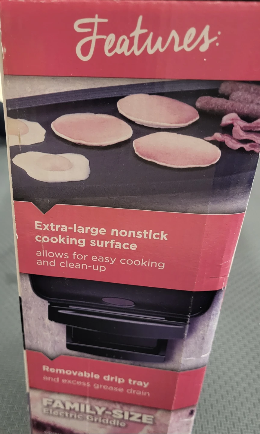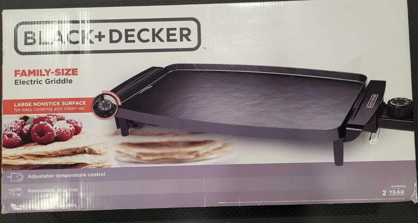 I'm selling a Black+Decker family-size electric griddle! It features an extra-large nonstick cooking surface for easy cooking and clean-up. It also has an adjustable temperature control and a removable drip tray. Barely used once!