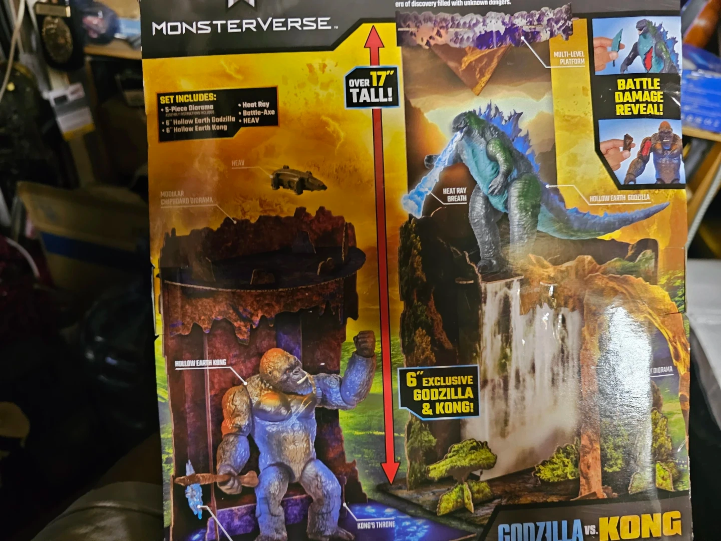 Selling a Godzilla vs. Kong Hollow Earth diorama set! It's a 5-piece multi-level diorama. The set includes a 6" Exclusive Godzilla & Kong. The diorama is over 17" tall and includes a 5-piece Hollow Earth diorama, 6" Hollow Earth Godzilla, 6" Hollow Earth Kong, Heat Ray Breath, and HEAV. Assembly is required. Box included!