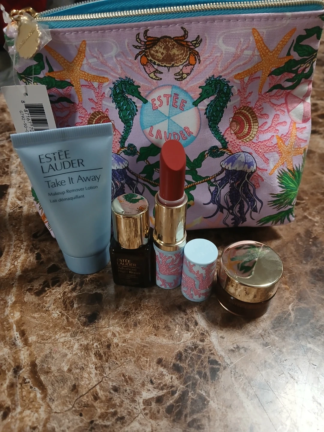 Selling an Estee Lauder makeup set that includes a cute makeup bag! The set features: