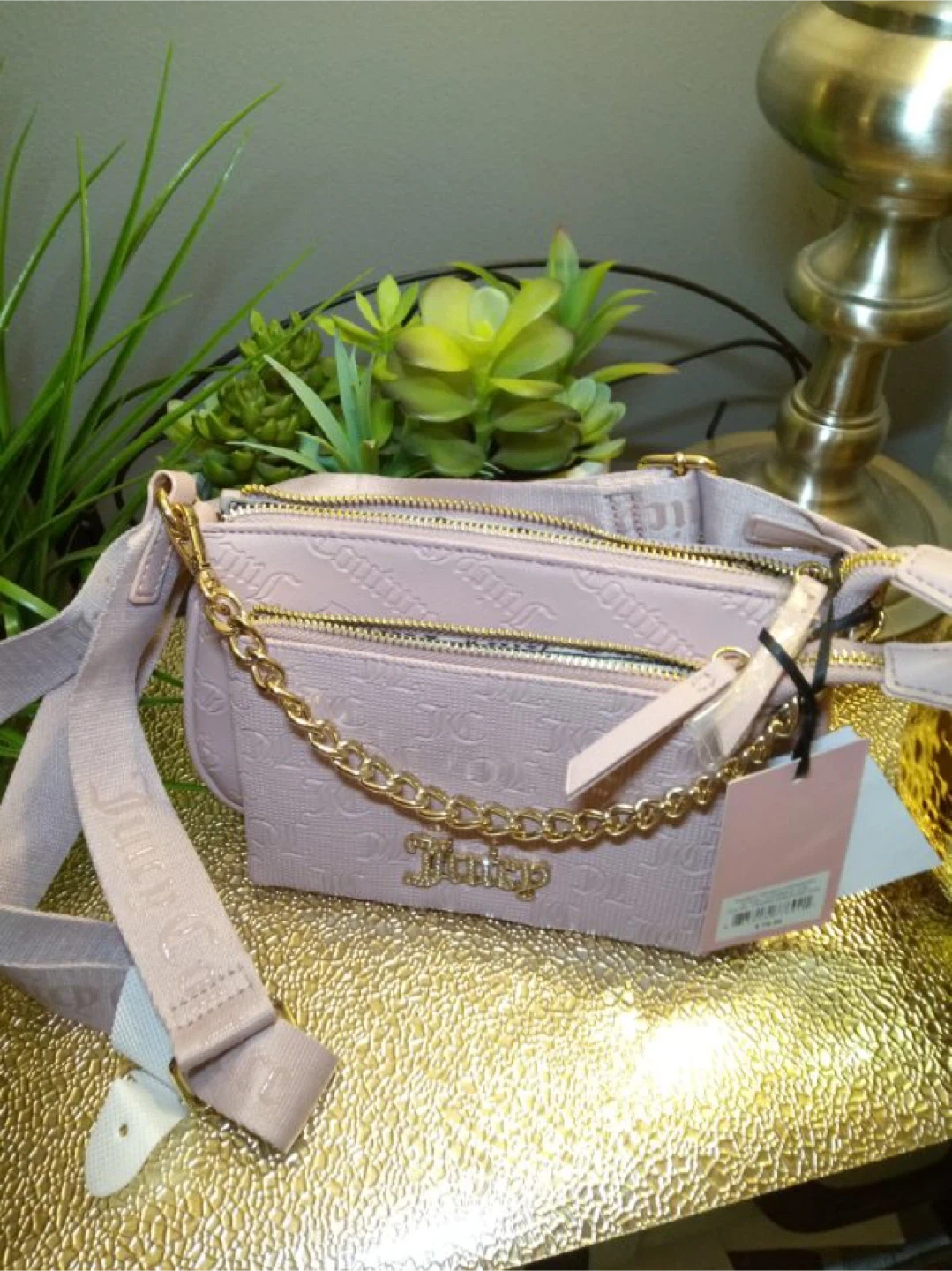 This is a new Juicy Couture Double Trouble Crossbody bag. It's a cute light pink color with a gold chain. The original price on the tag is $79!