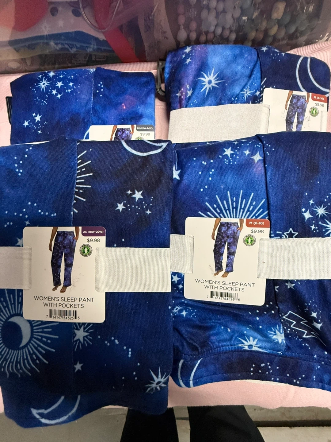 I have some women's sleep pants with pockets available. They feature a fun star and moon design on a blue background. The sizes I have are Medium (8-10) and 2X (18W-20W). They are new with tags and ready for you!