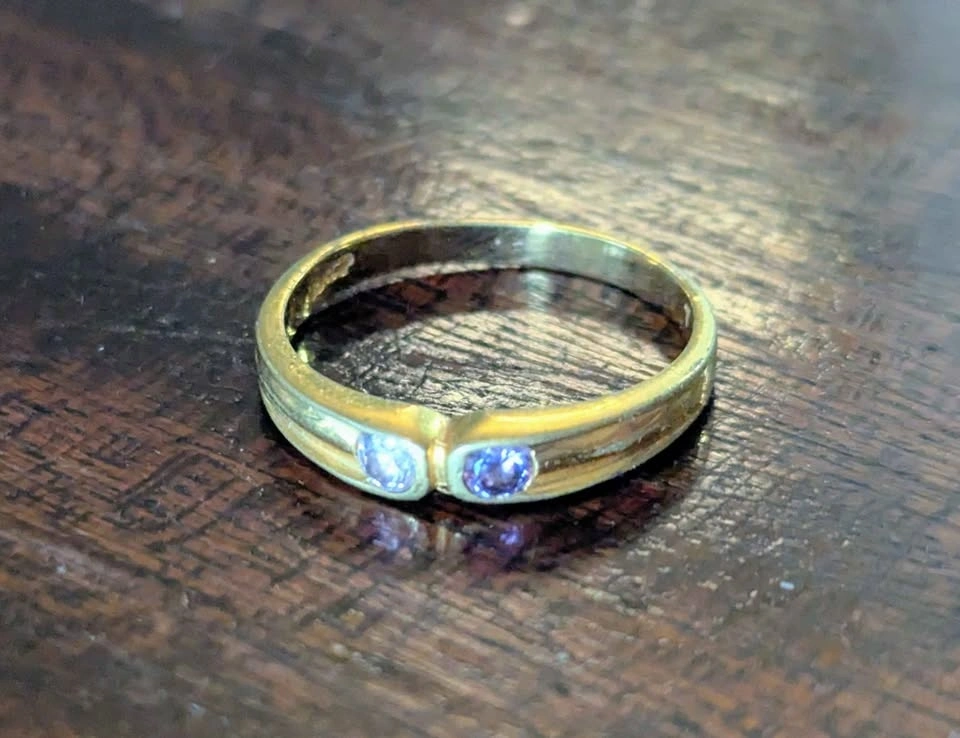 Features two striking pink and purple stones set in a classic band.