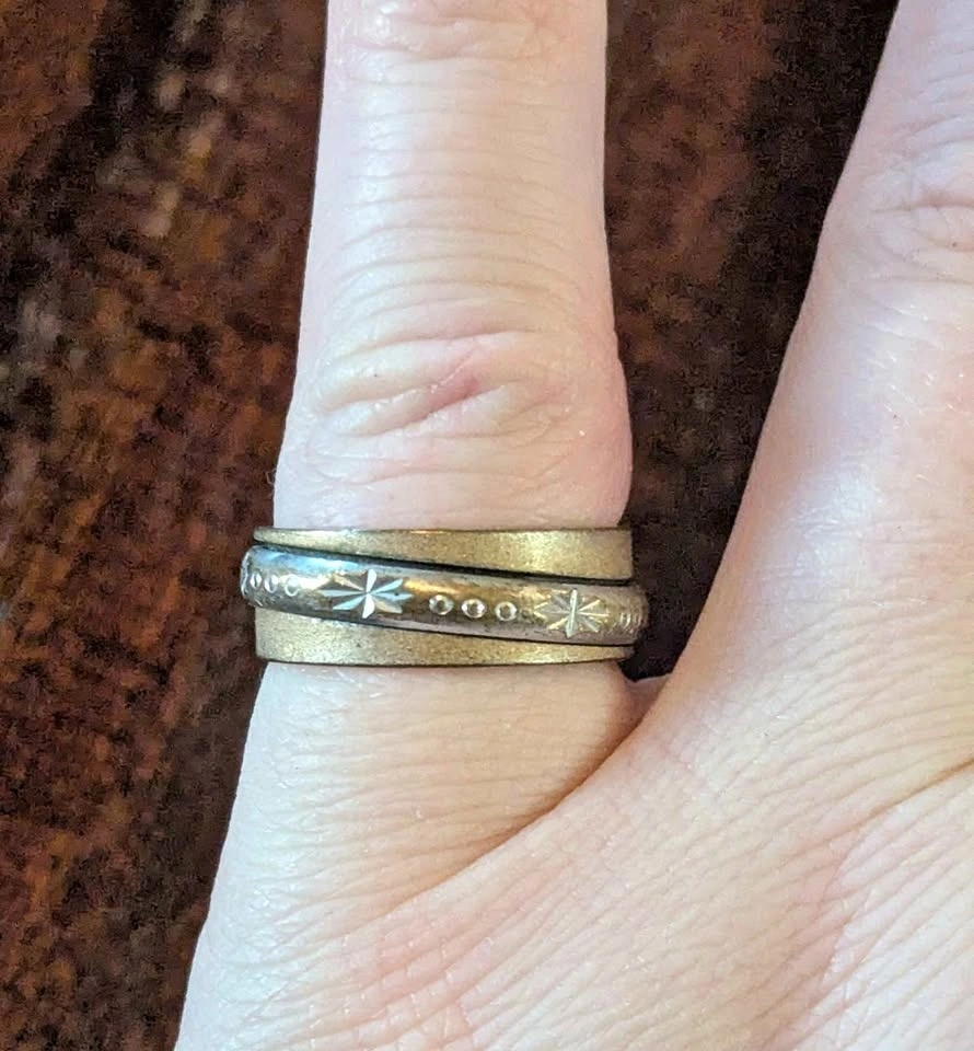 One is a simple, smooth gold-toned band. The second is a silver-toned band featuring a charming engraved pattern of starbursts and small dots.
