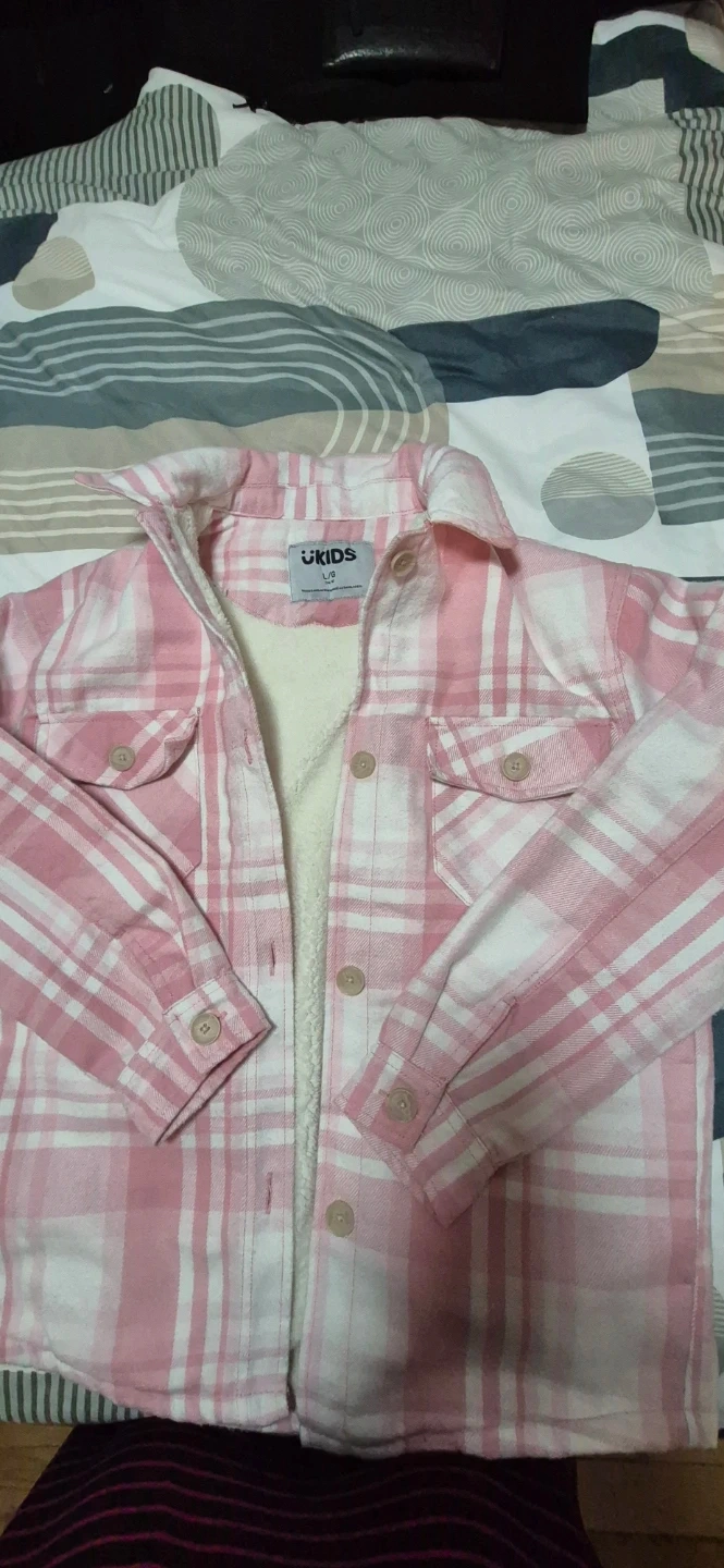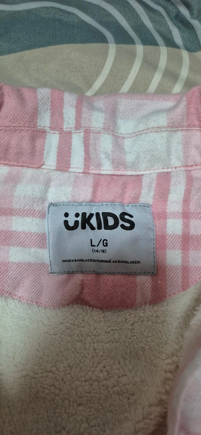 This is a cute pink and white plaid shirt from UKIDS. It's a size L/G, which is equivalent to a size 14/16. The shirt is in great condition and perfect for layering!