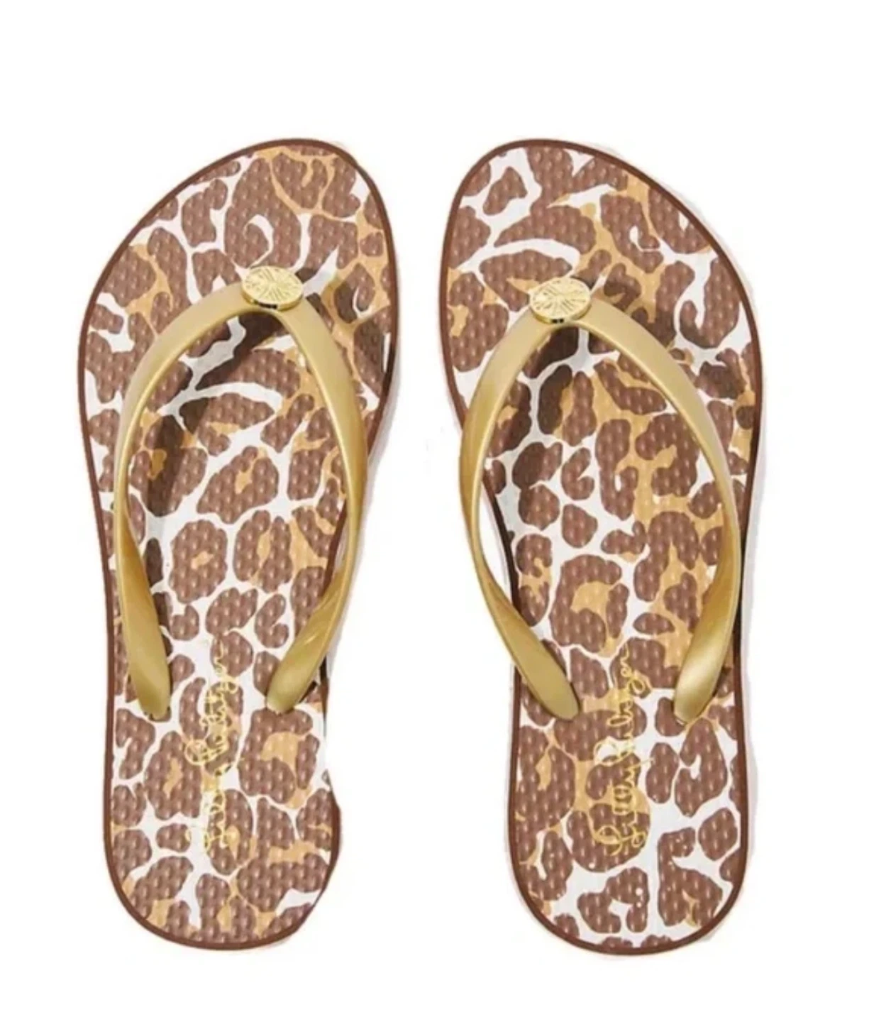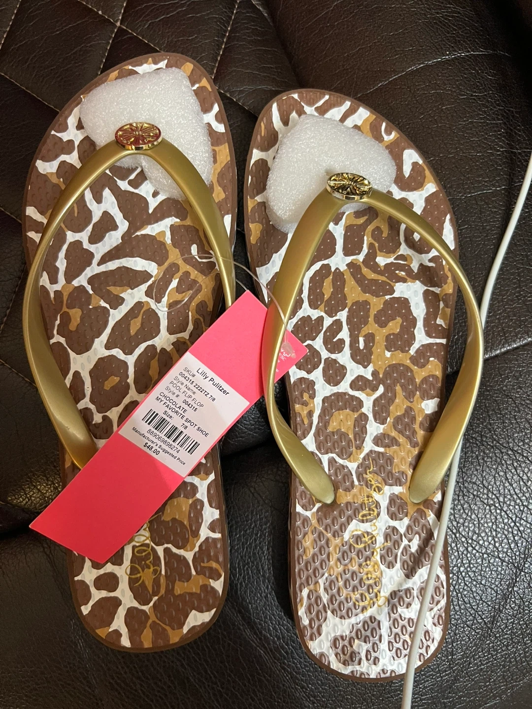 These brand new Lilly Pulitzer thong sandals are in a fun chocolate spot print! They're a size 7/8 and feature a gold strap. The original price tag shows they retail for $48