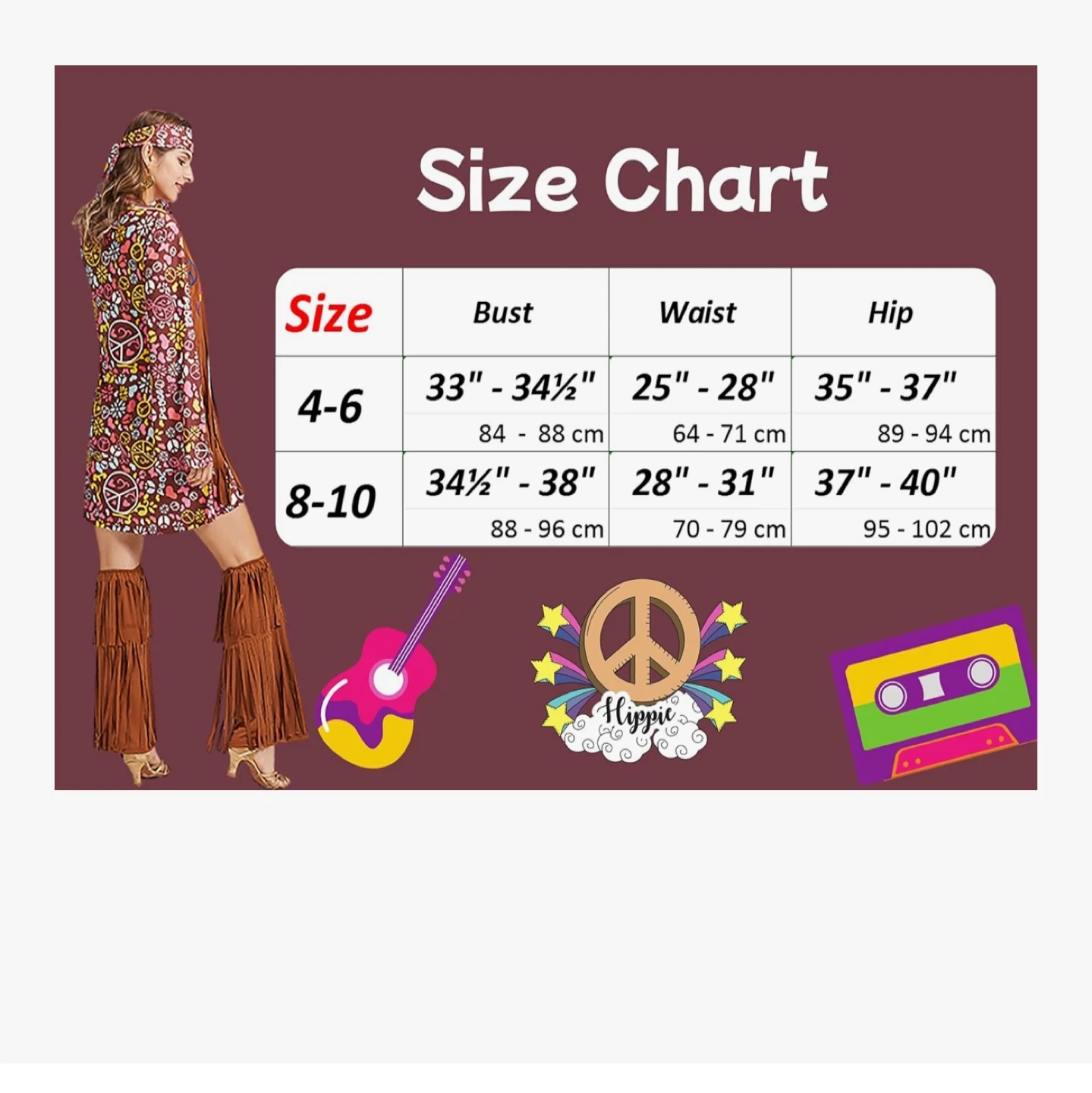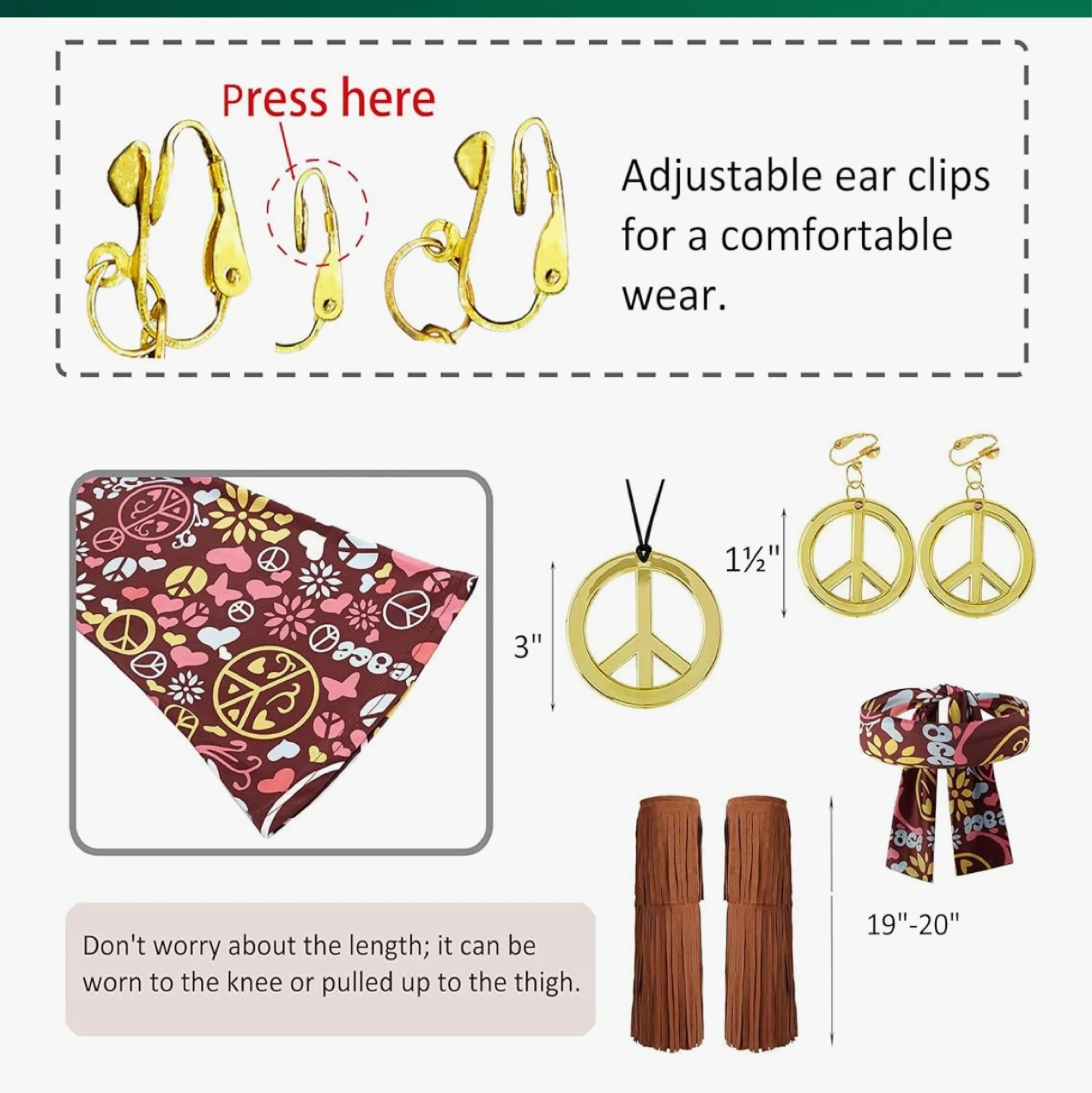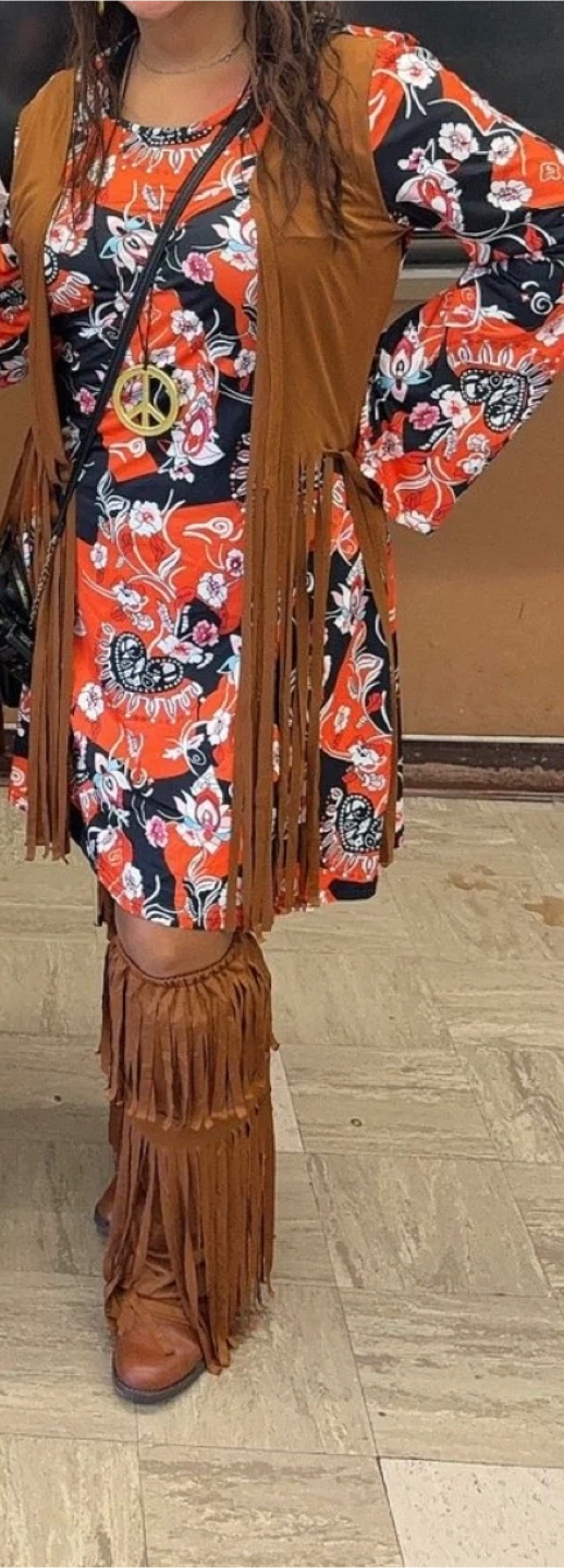 Get ready to groove with this fun hippie costume set! It includes a dress (size 8-10), a fringe vest, and matching fringe boots. The set also comes with peace sign jewelry and a beaded headband to complete the look. Perfect for a costume party or just channeling your inner flower child!