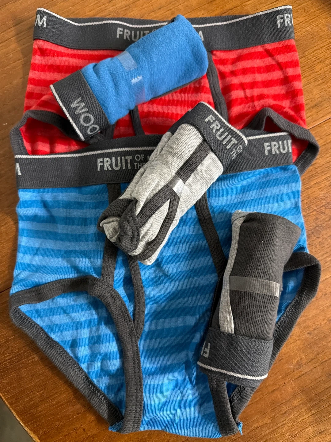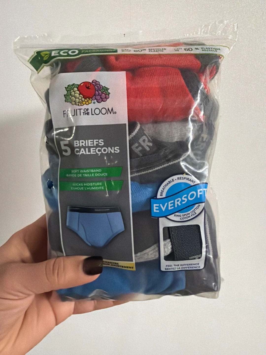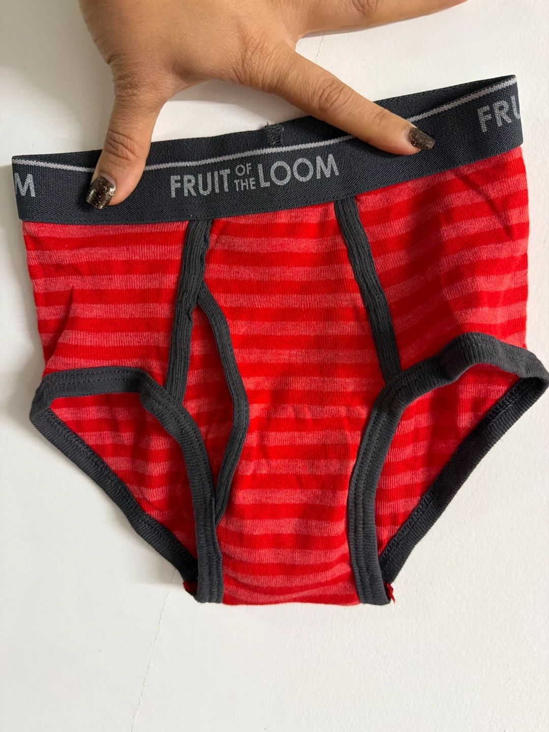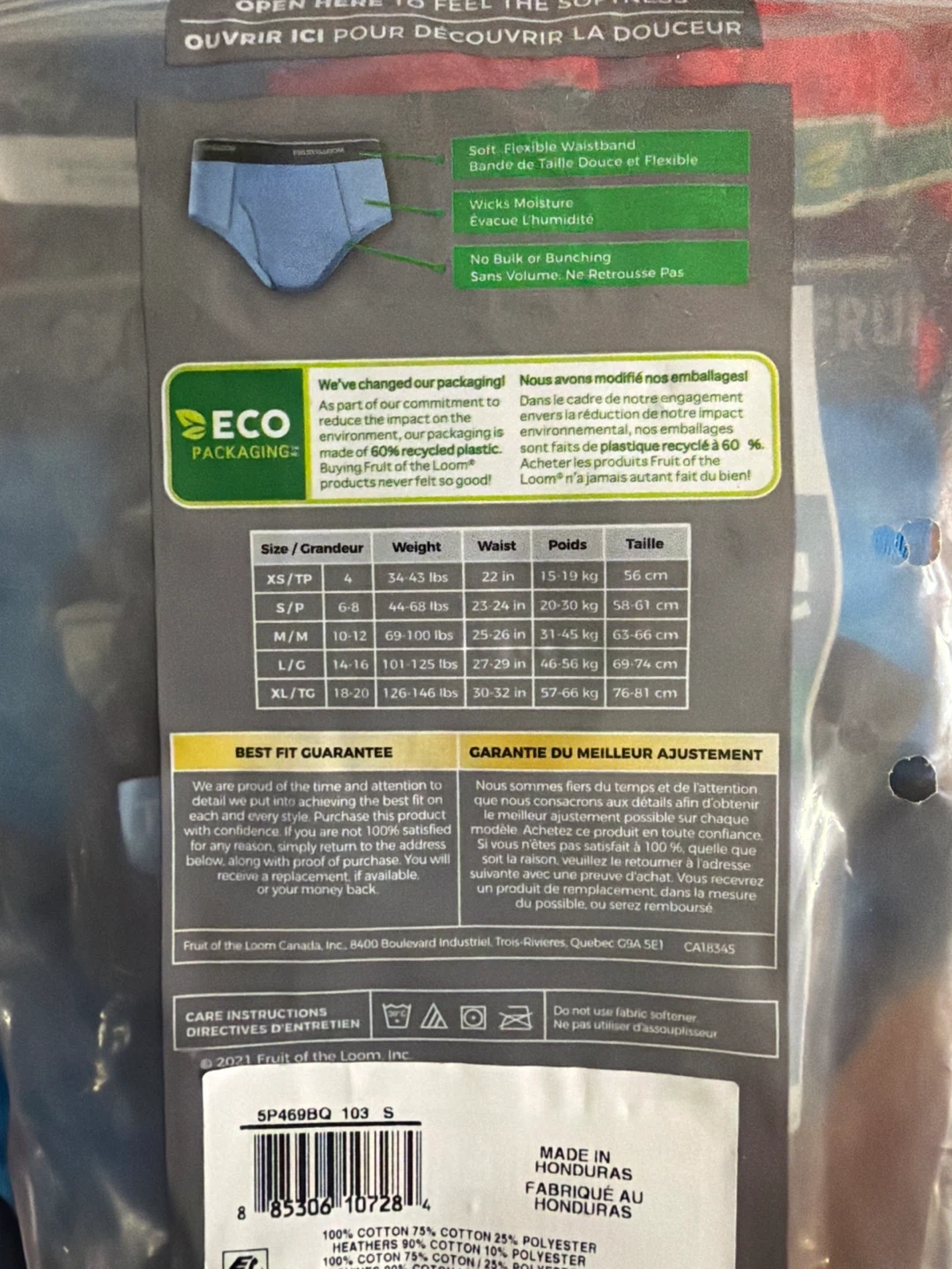 Selling a pack of Fruit of the Loom boys' briefs, size S (6-8). These briefs feature a soft, flexible waistband and wick away moisture. They are made of 100% cotton and come in a pack of 5. Feel the difference!