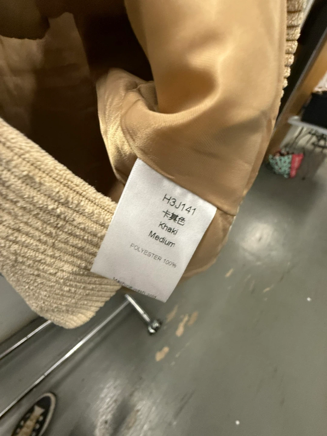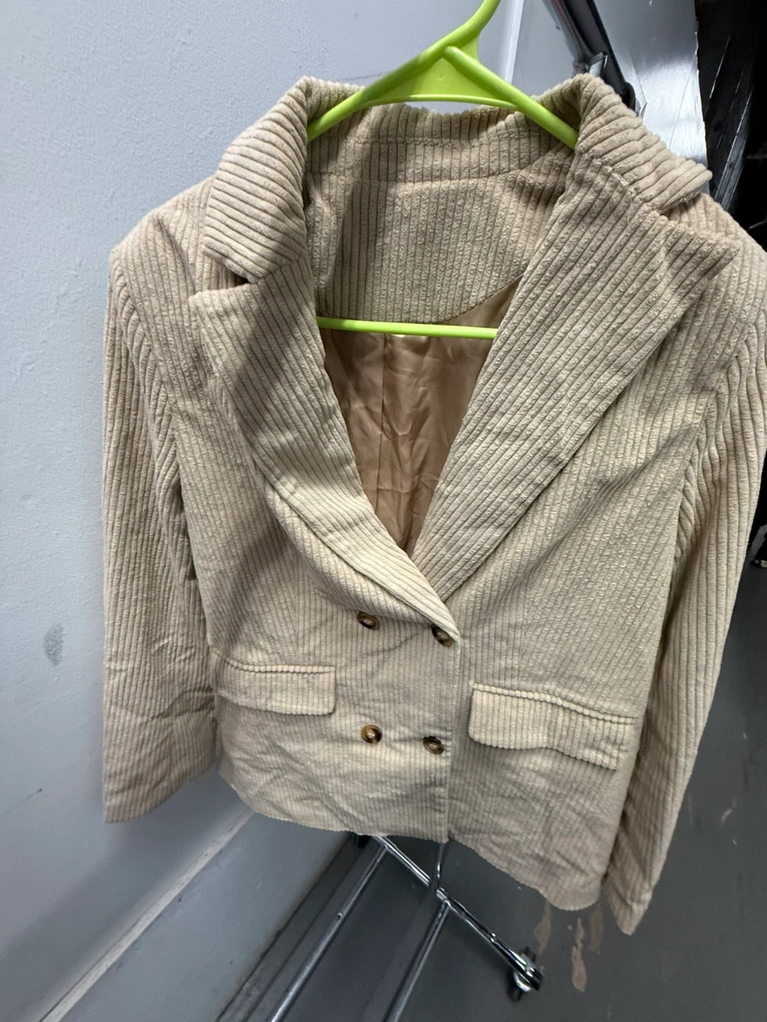 Selling a stylish khaki corduroy blazer in size medium! It's made of 100% polyester and has a comfortable fit. Perfect for adding a touch of texture to your wardrobe
