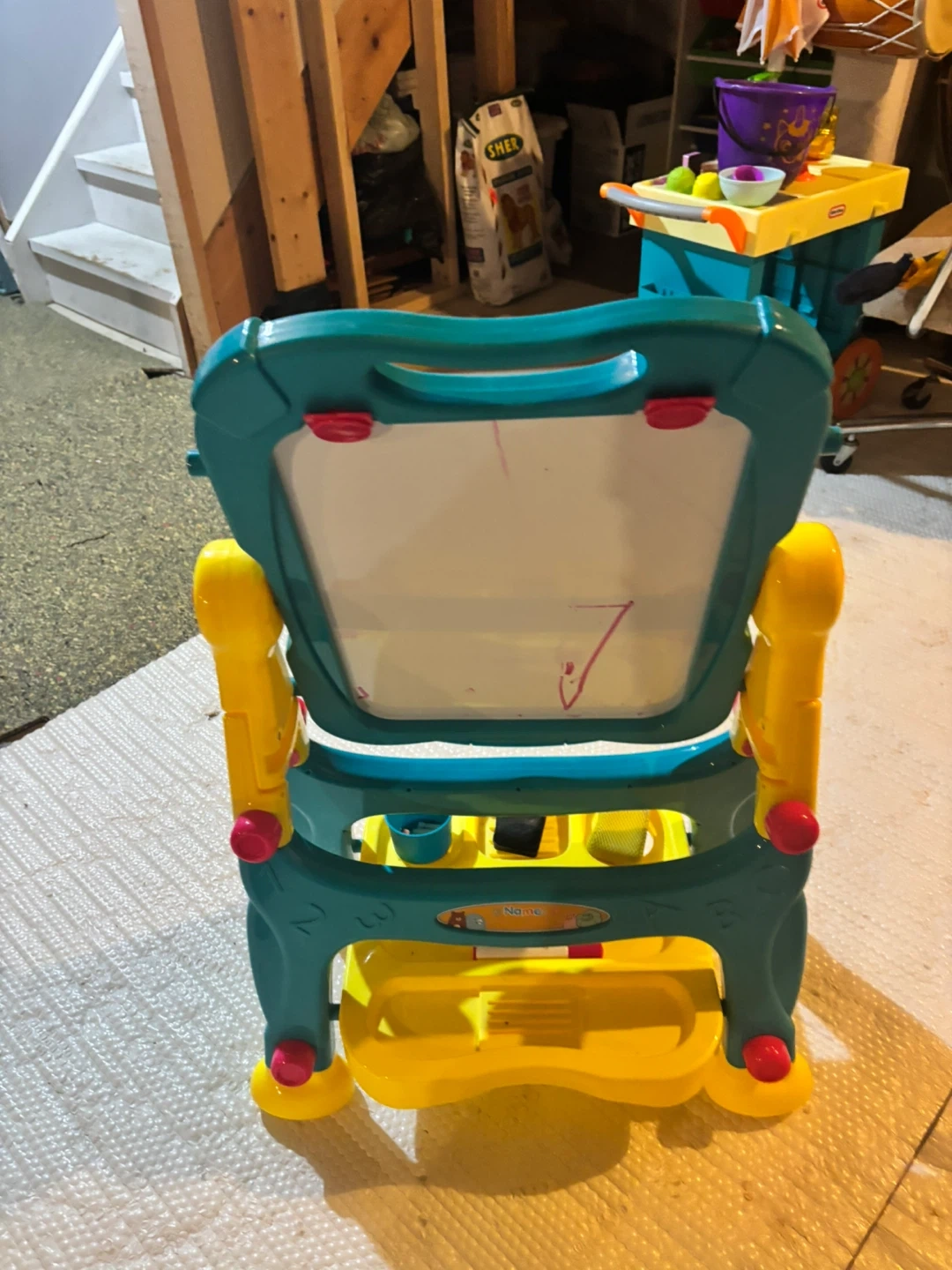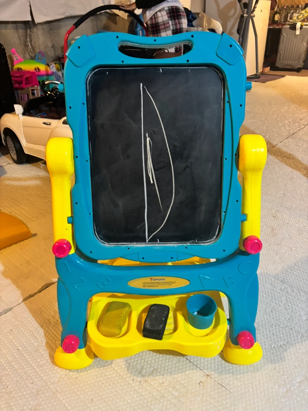 A fun Tummons easel for your little artist! It's in great shape and ready for lots of creativity. Features a chalkboard on one side and a whiteboard on the other, perfect for drawing, writing, and learning. Comes with a tray to hold chalk, erasers, and markers, so everything stays organized
