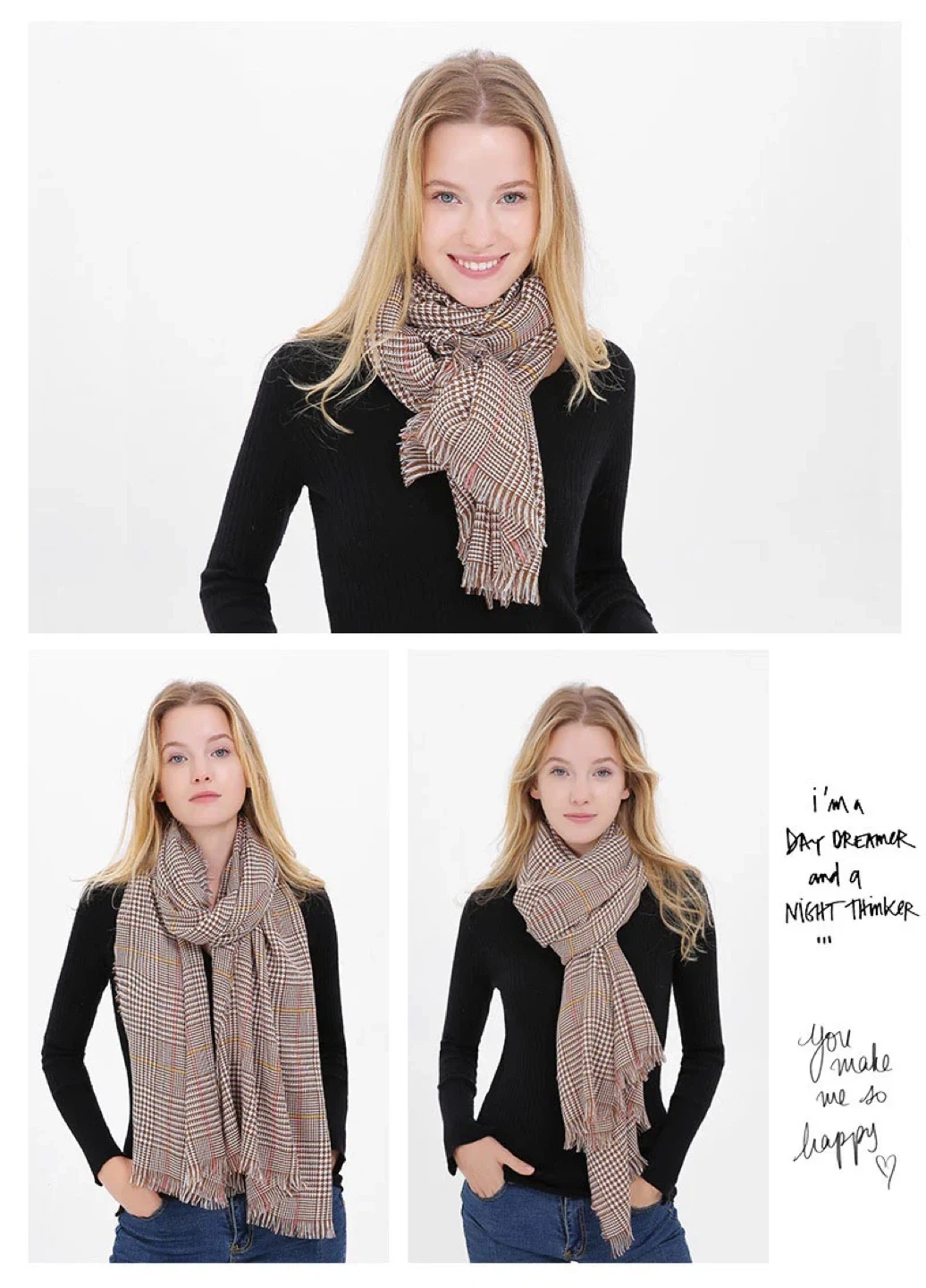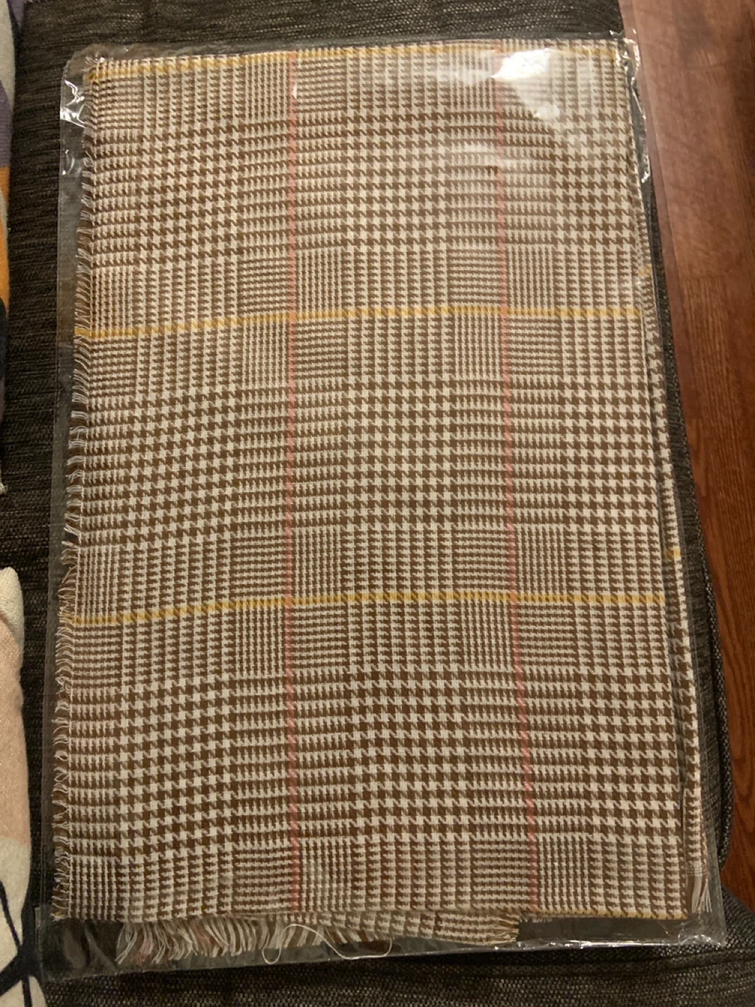 - Selling a classy plaid-patterned scarf in brown and white, with red and yellow accents!