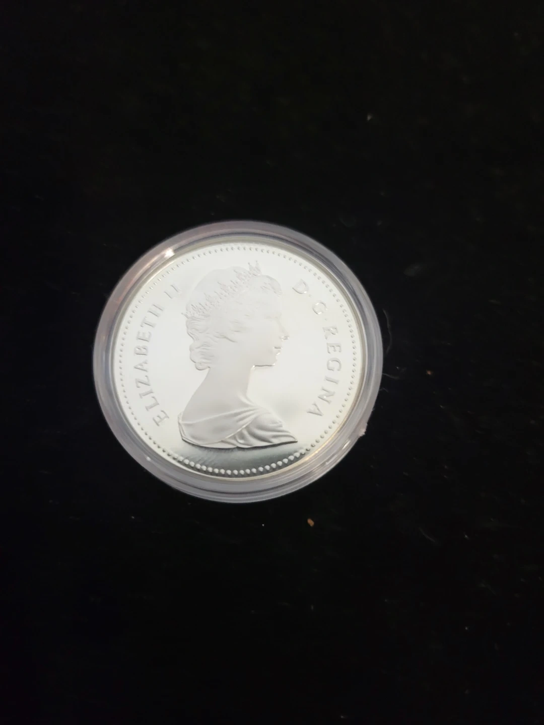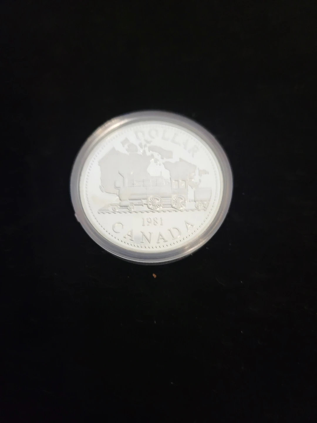 Selling a 1981 Canadian silver dollar coin. It features Queen Elizabeth II on one side and a train on the other. A great addition to any collection