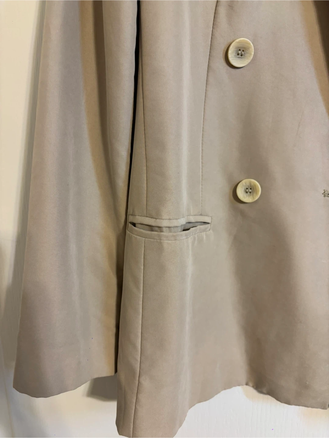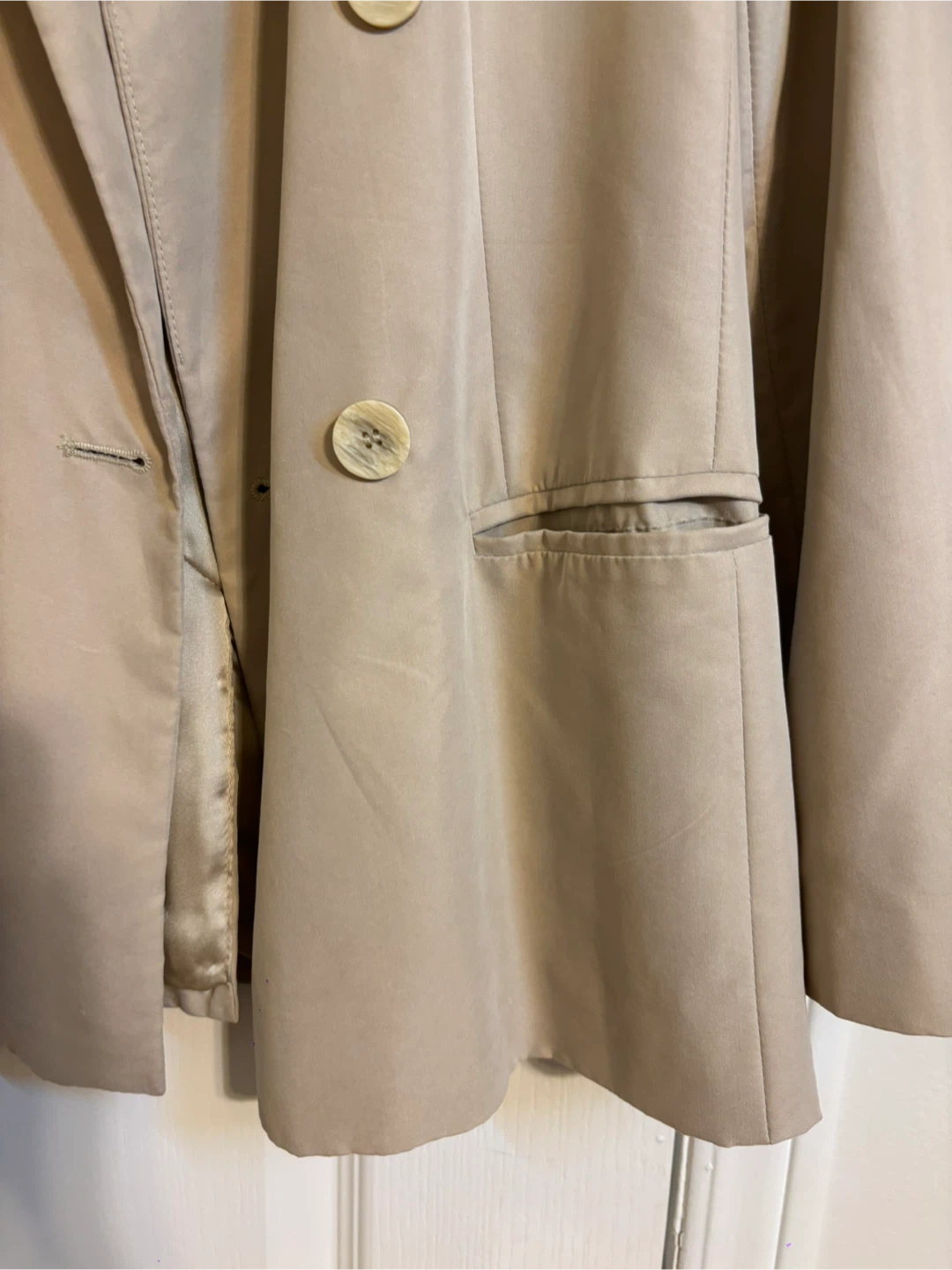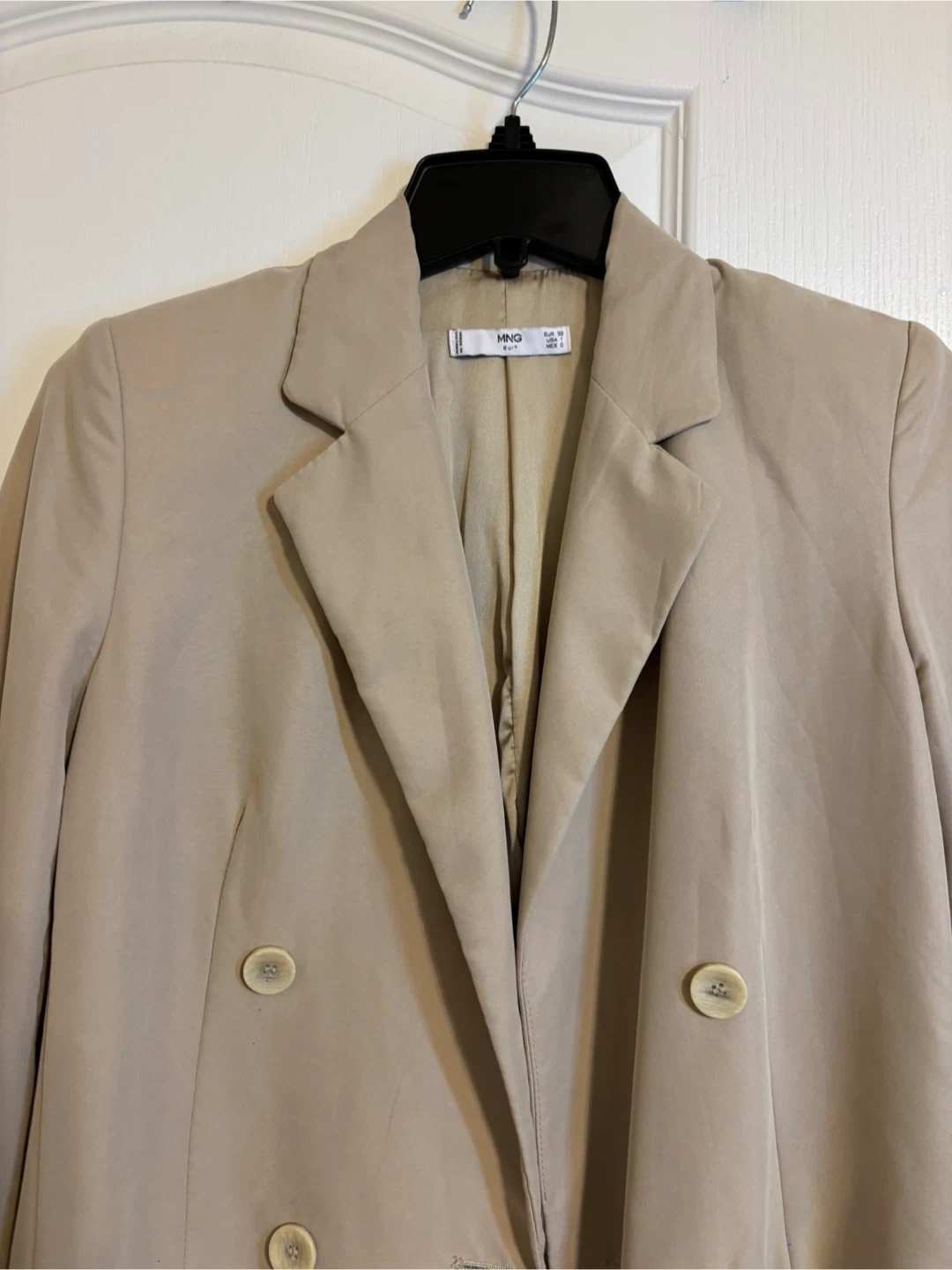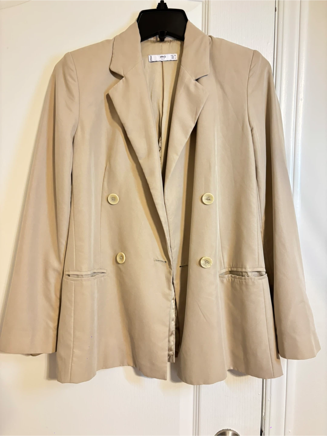 Selling a beige blazer from Mango! It's a stylish piece that can be dressed up or down. The blazer features a double-breasted design with button closures and functional pockets. Perfect for adding a touch of sophistication to any outfit