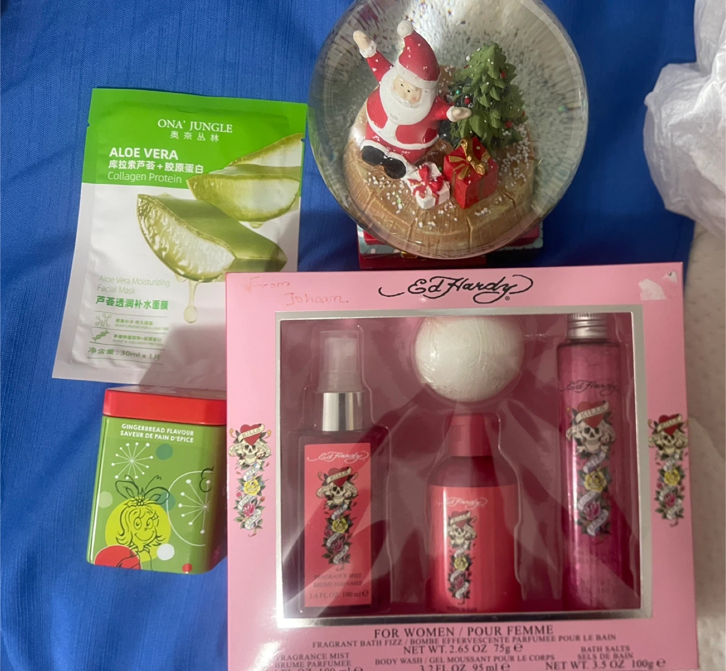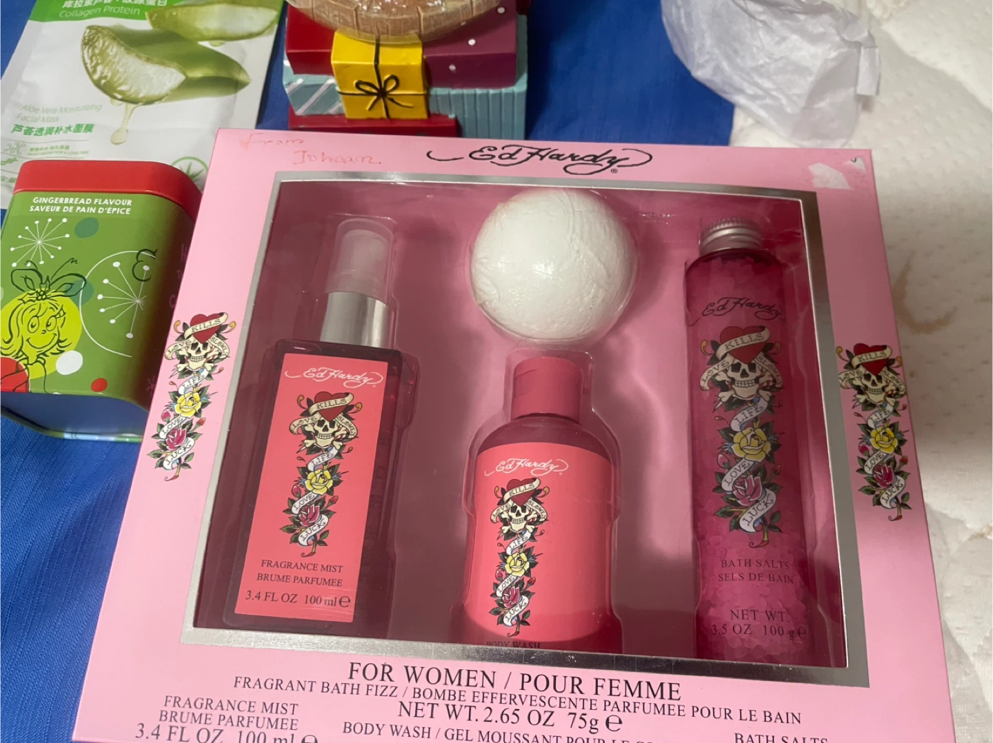 brand new Ed Hardy Fragrant Bath Fizz set for women. It includes fragrance mist, body wash, and bath salts.