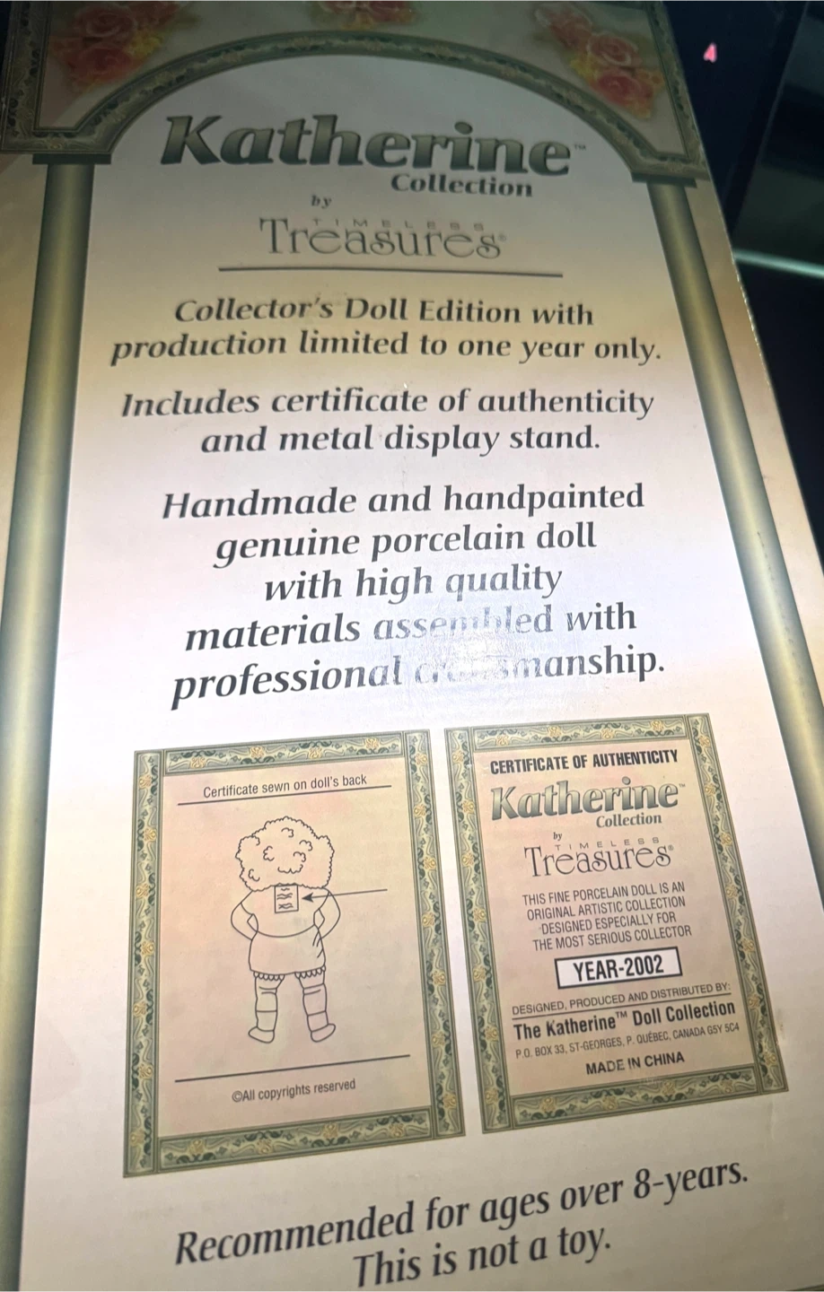 Selling a Katherine Collection Timeless Treasures Collector's Doll Edition. This is a limited edition doll with production limited to one year only. It includes a certificate of authenticity and metal display stand. The doll is handmade and hand painted genuine porcelain doll with high quality materials assembled with professional craftsmanship. Recommended for ages over 8 years