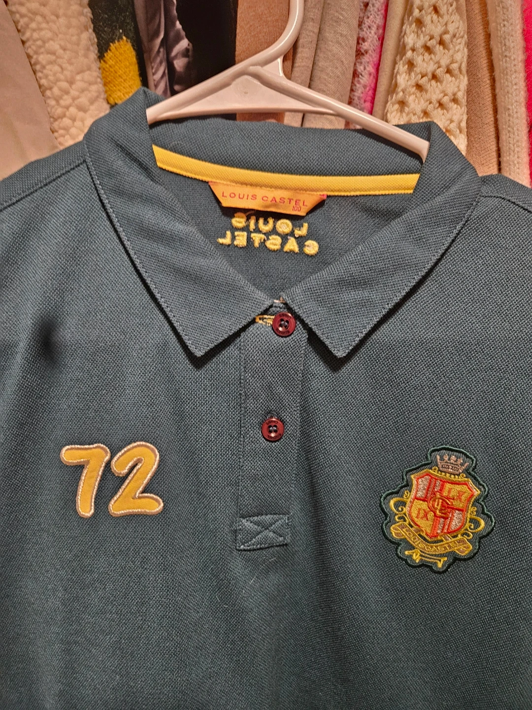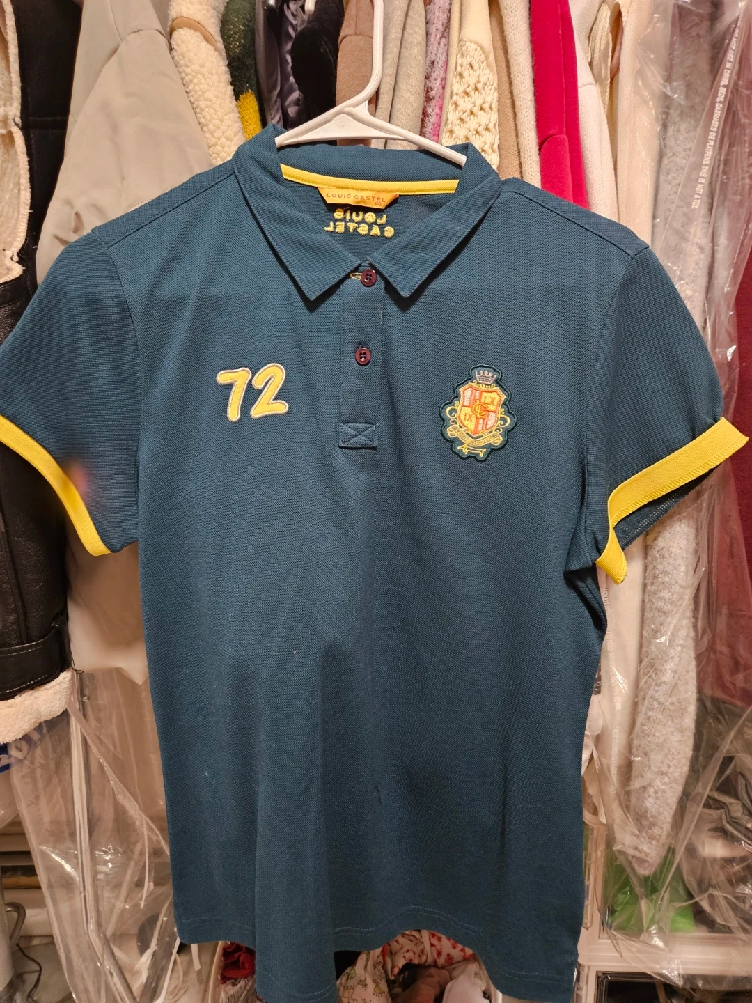 Here's a stylish Louis Castel golf polo shirt! It features the number '72' on the front and a cool crest design. The color is a nice teal with yellow accents on the collar and sleeves. Perfect for a day on the golf course or just a casual outing