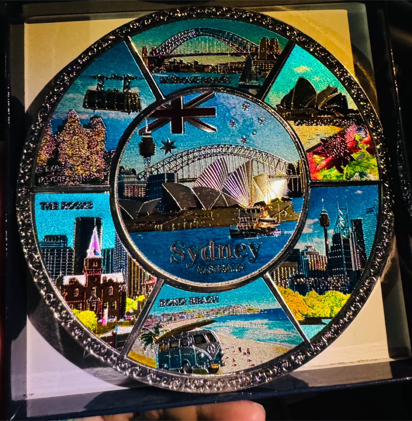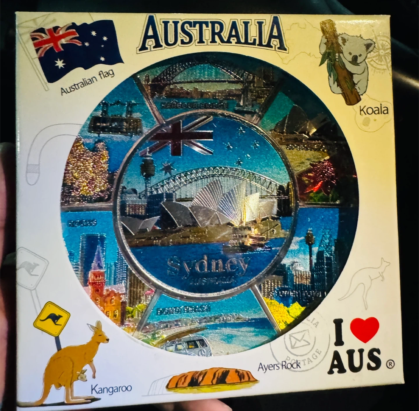 This is a souvenir plate from Australia, featuring iconic scenes of Sydney. It comes with its original box!