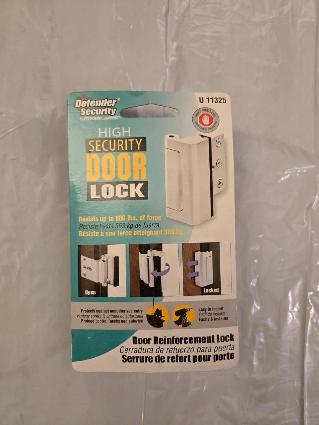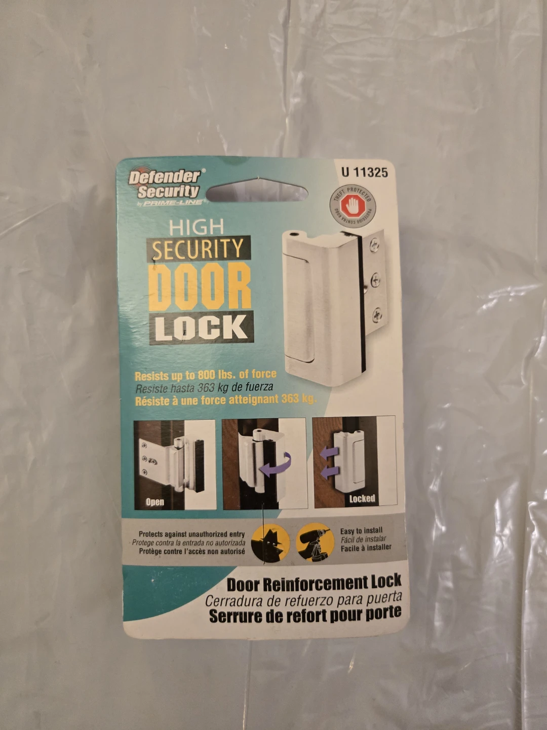 Selling a brand new Defender Security door reinforcement lock. It resists up to 800 lbs of force and is easy to install. Protects against unauthorized entry. Includes easy to follow instructions.