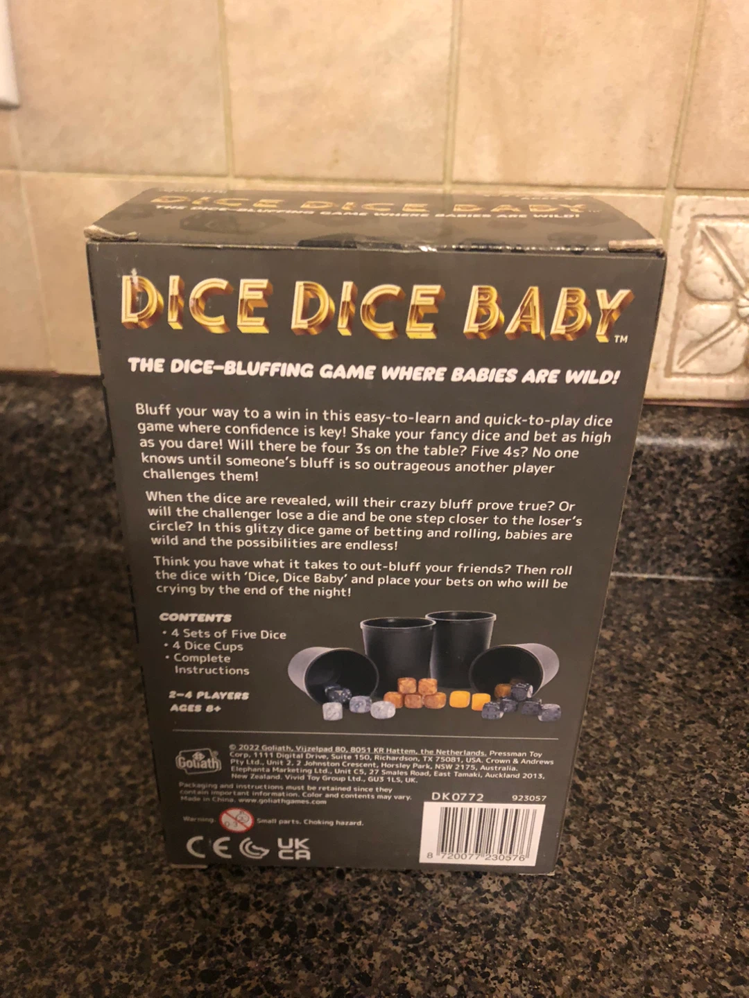 Get ready for some dice-bluffing fun with Dice Dice Baby by Goliath! This game is perfect for 2-4 players, ages 8+. The box includes 4 sets of five dice, 4 dice cups, and complete instructions for hours of entertainment with friends and family