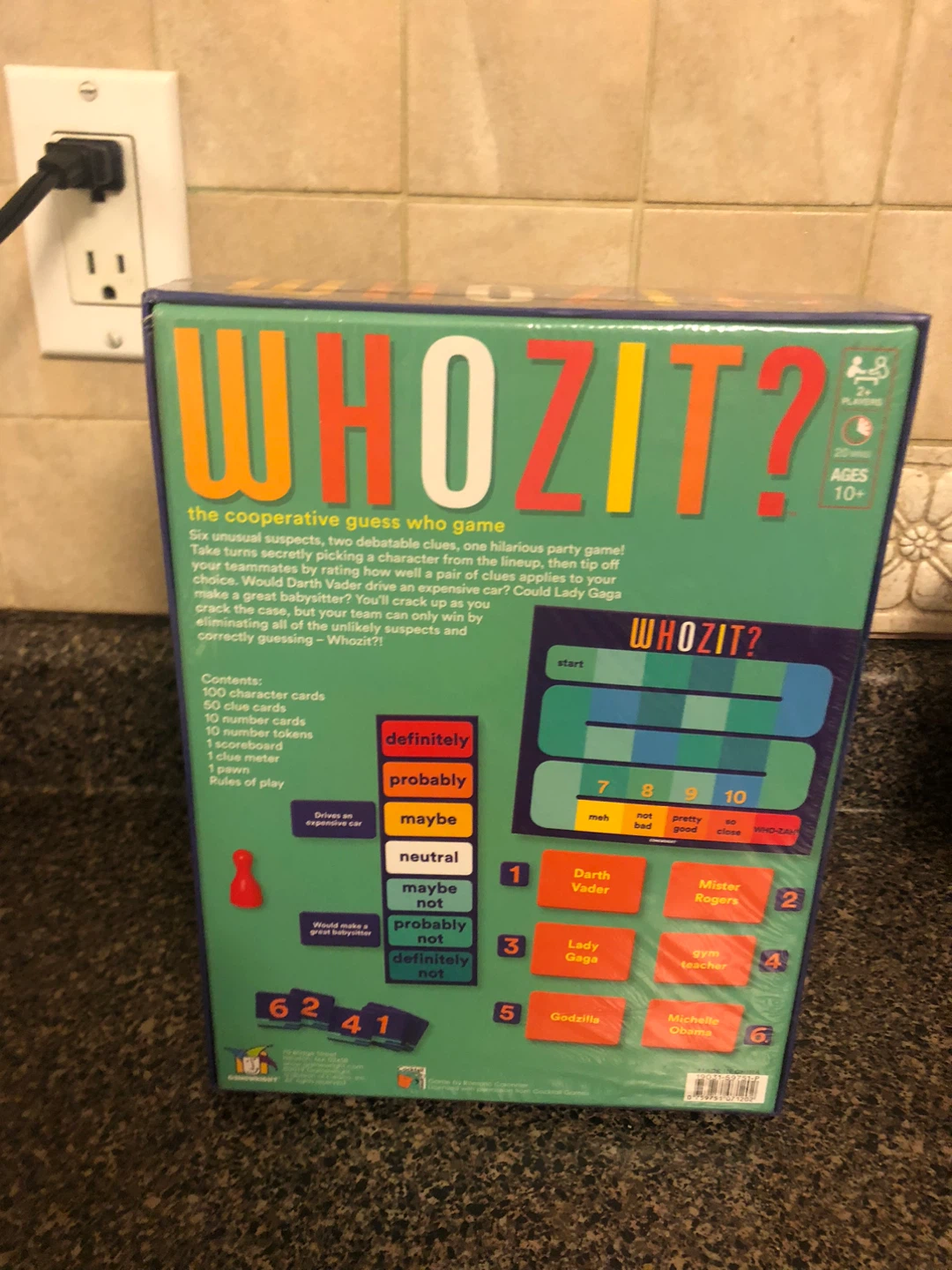 Selling a brand new, still-in-shrink-wrap copy of Whozit? by Gamewright! It's a cooperative guessing game for 2+ players, ages 10+. Perfect for family game night or a fun get-together with friends