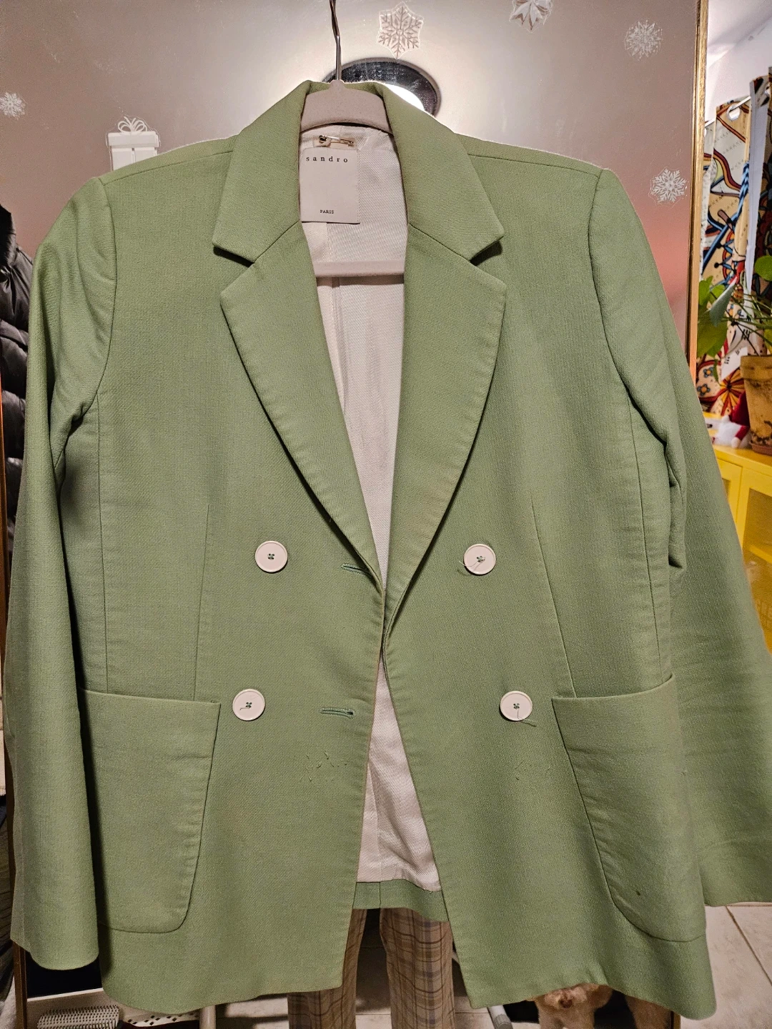 Selling a Sandro Paris blazer in a lovely green color. It's in great condition and ready to wear. The blazer is a stylish addition to any wardrobe!