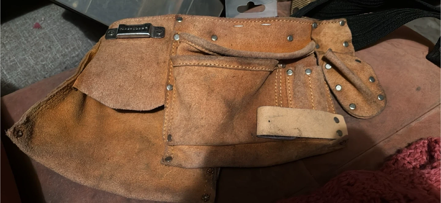 Selling a used leather tool belt. It has multiple pockets and loops for various tools. The leather is worn but still durable and functional.