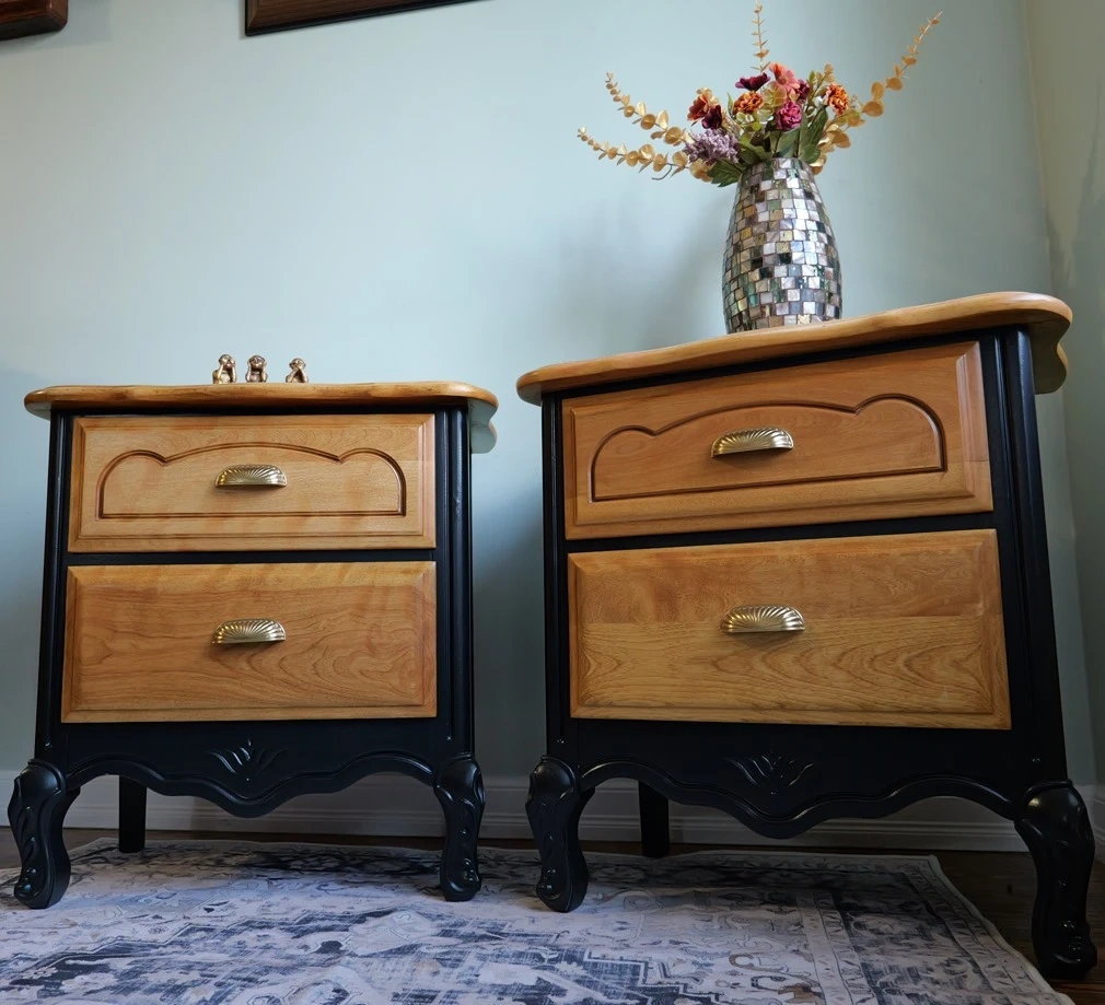 MADE IN CANADA! Canadian made French provincial style night stands/side tables, restored to show natural wood stained with golden oak which contrasts the painted frame with black onyx blends sophistication with charm.