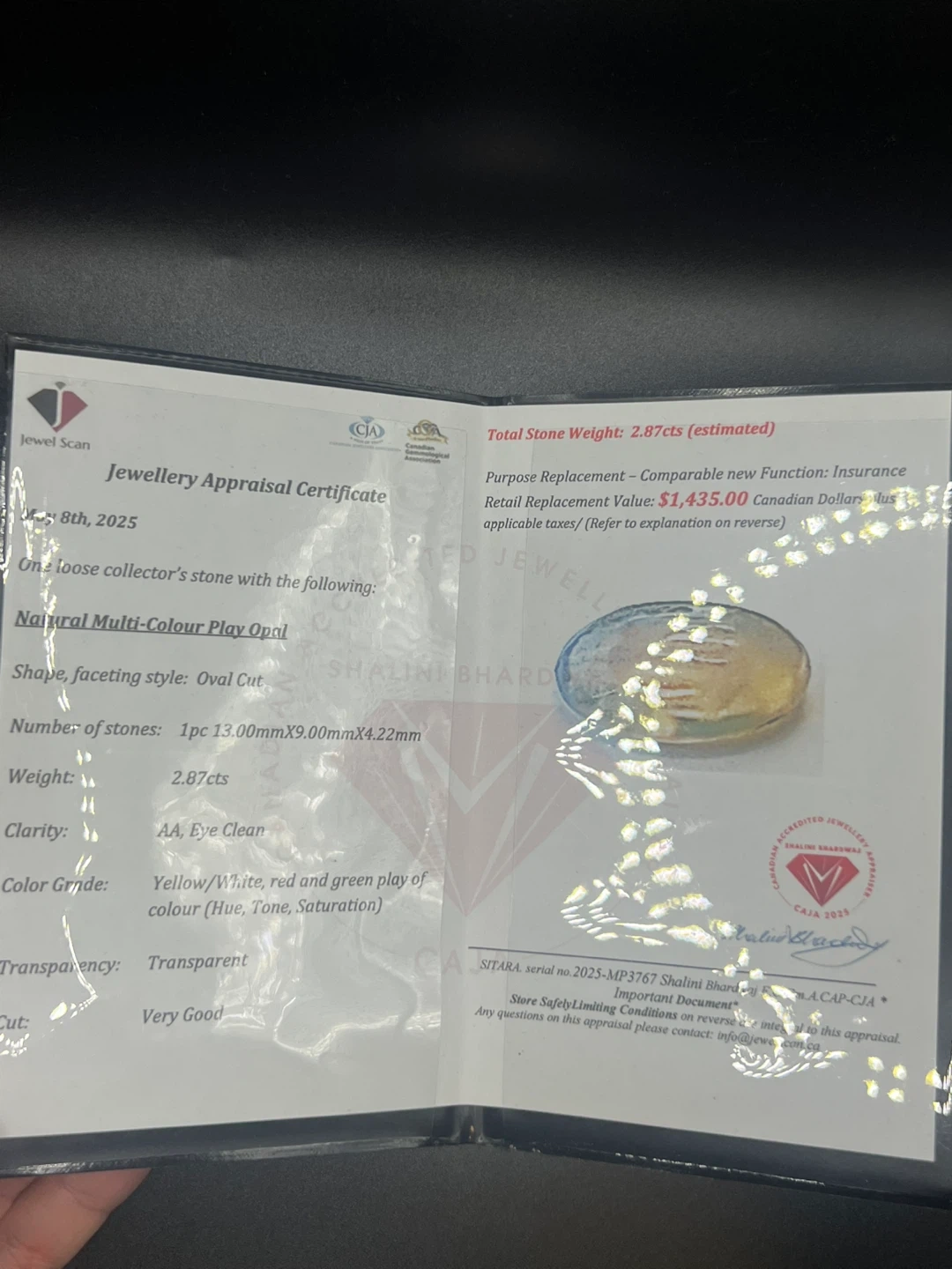 Selling a beautiful natural multi-colour opal ring! The appraisal certificate indicates the stone is 13.00mm x 9.00mm x 4.22mm with a weight of 2.87cts. The clarity is AA, eye clean, and the cut is very good. The colour grade is yellow/white, red and green play of colour. According to the certificate, the retail replacement value is $1,435.00 CAD.