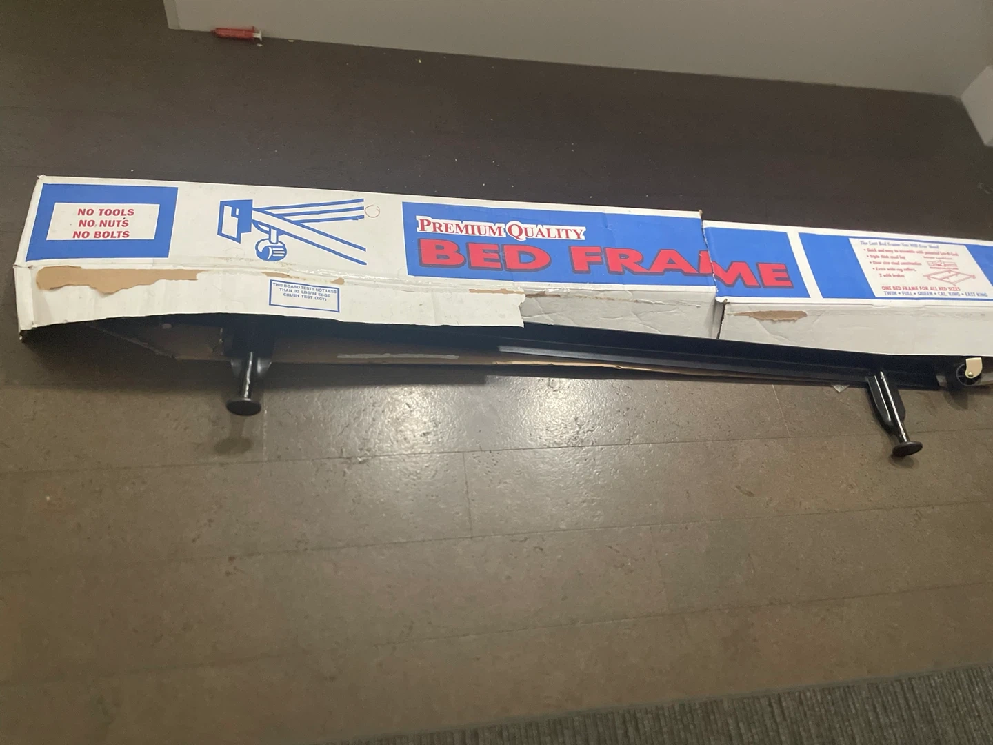 Selling a premium quality bed frame that fits all bed sizes, from twin to east king! It's designed for easy assembly with patented lock and click, and it's super sturdy. Plus, no tools, nuts, or bolts are required for setup