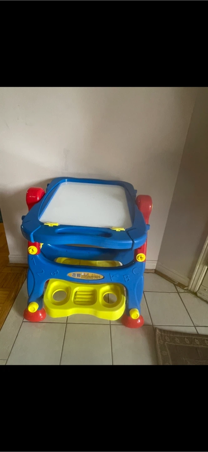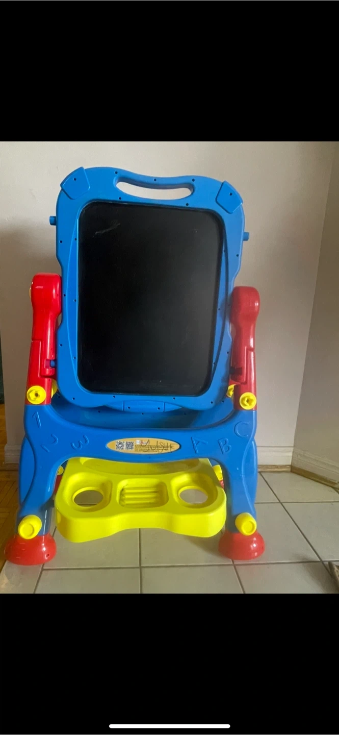 Selling a kids' easel in good condition! It's blue, yellow, and red, and has a whiteboard on one side and a chalkboard on the other. Perfect for your little artist to explore their creativity