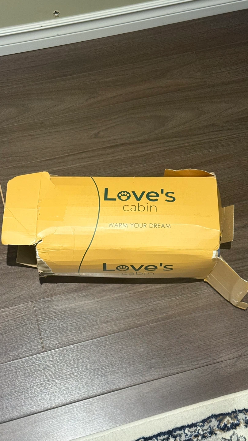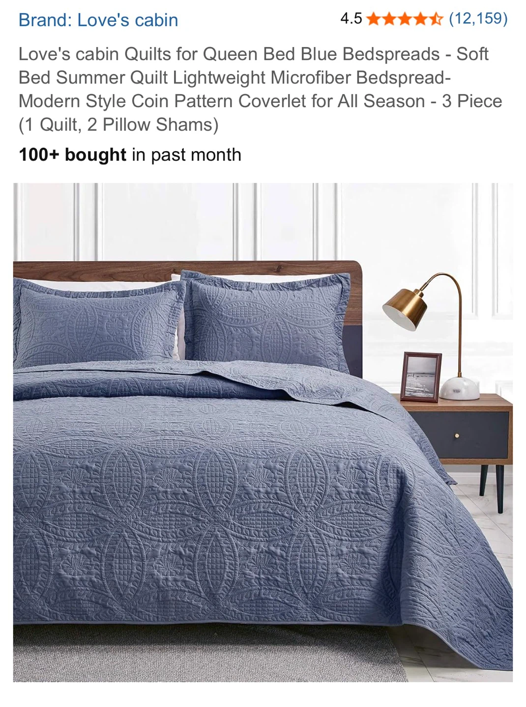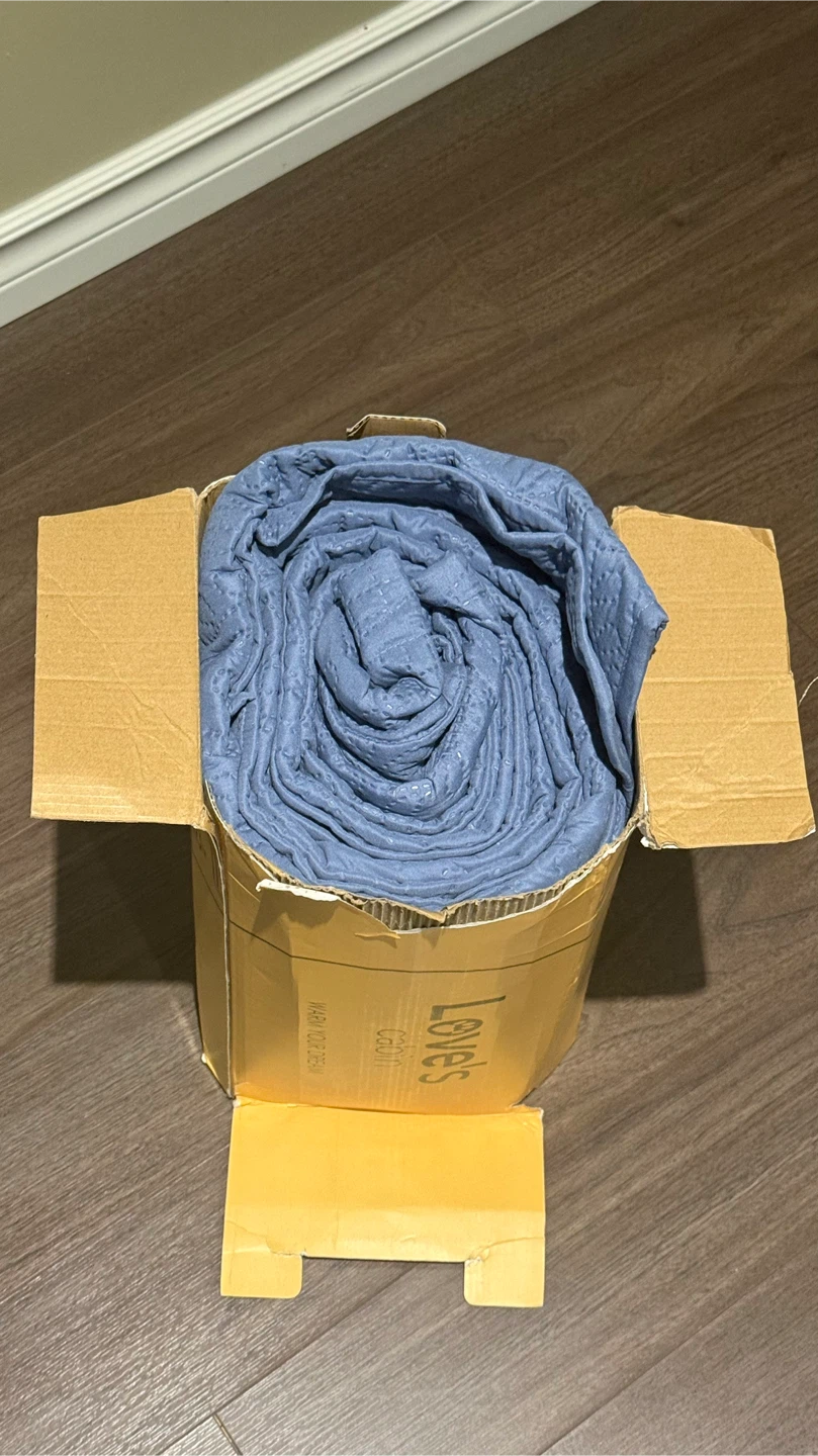 A Love's Cabin quilt set for a queen bed. It's a lovely blue colour and includes the box. Box is damaged but the product has never been used, it’s still brand new. Selling because I had a similar one gifted to me recently.
