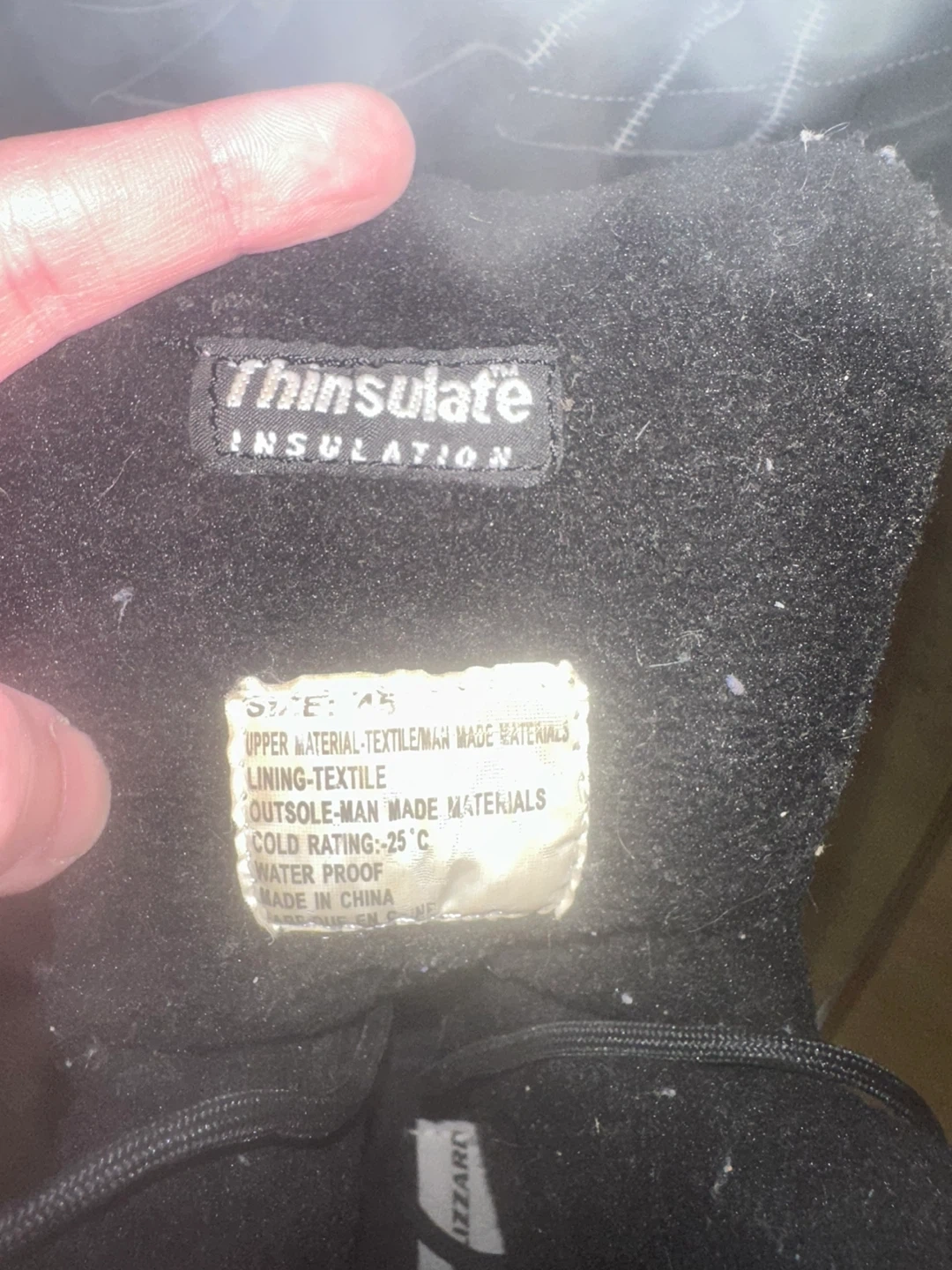 Selling a pair of black Blizzard snow boots in size 45 These boots feature Thinsulate insulation and are waterproof. They are rated for cold temperatures down to -25°C. The upper material is made of textile/man-made materials, with a textile lining and man-made outsole.