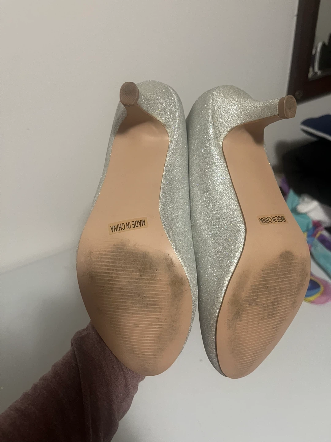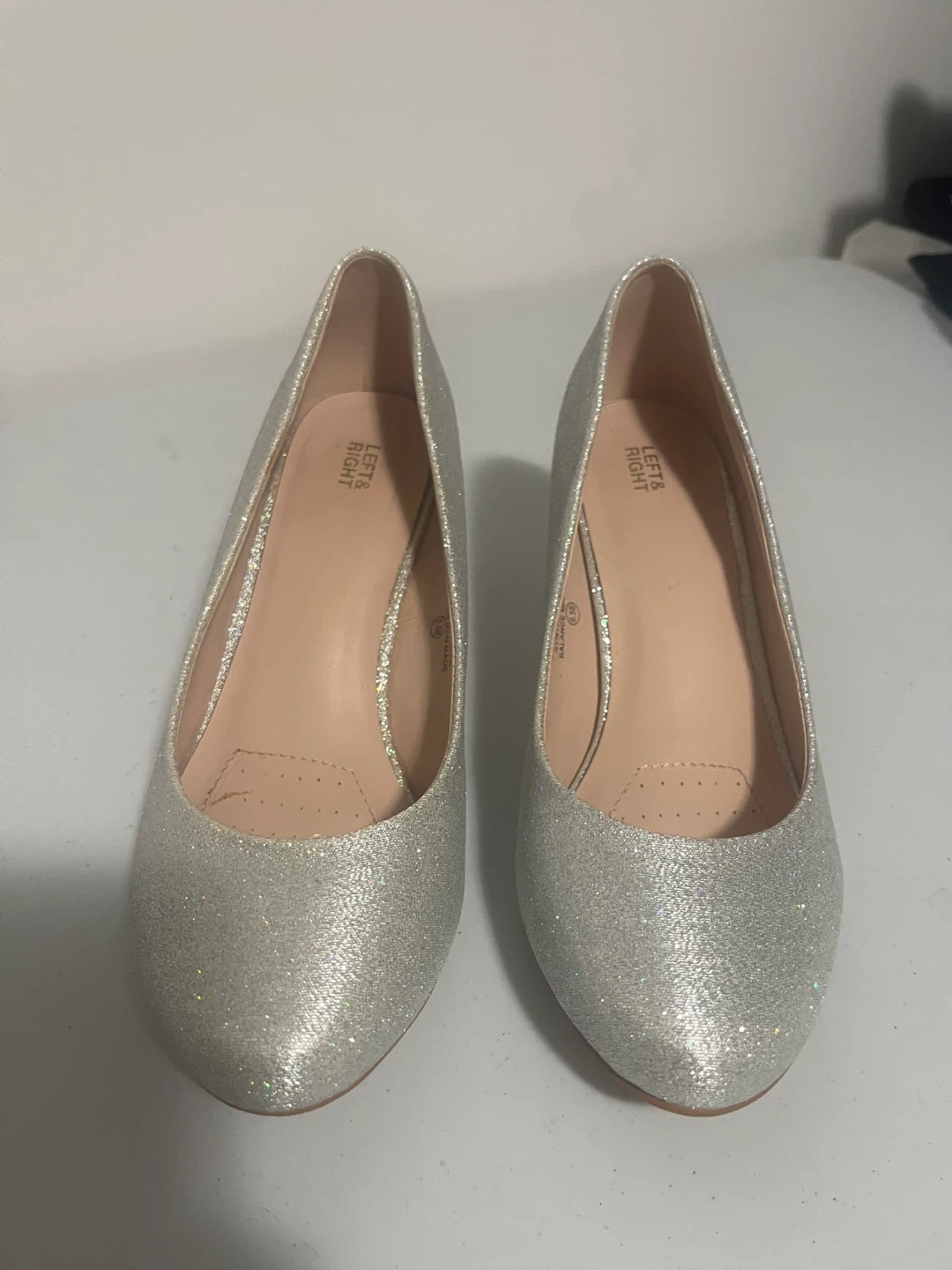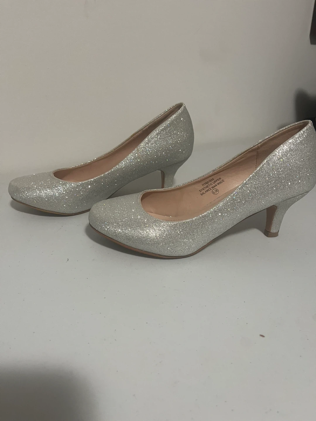 Selling a pair of Left & Right silver glitter heels in size 6.5. They come with the original box. The box indicates they originally retailed for $49.99. Perfect for a special occasion!