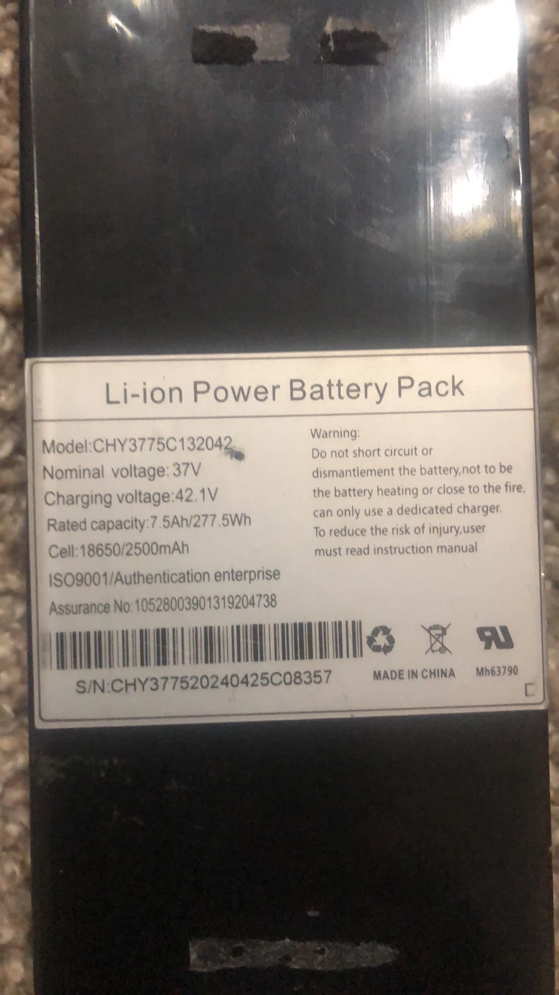 Selling a Li-ion Power Battery Pack, model CHY3775C132042. It has a nominal voltage of 3.7V and a charging voltage of 42.1V. The rated capacity is 7.5Ah/277.5Wh and the cell is 18650/2500mAh