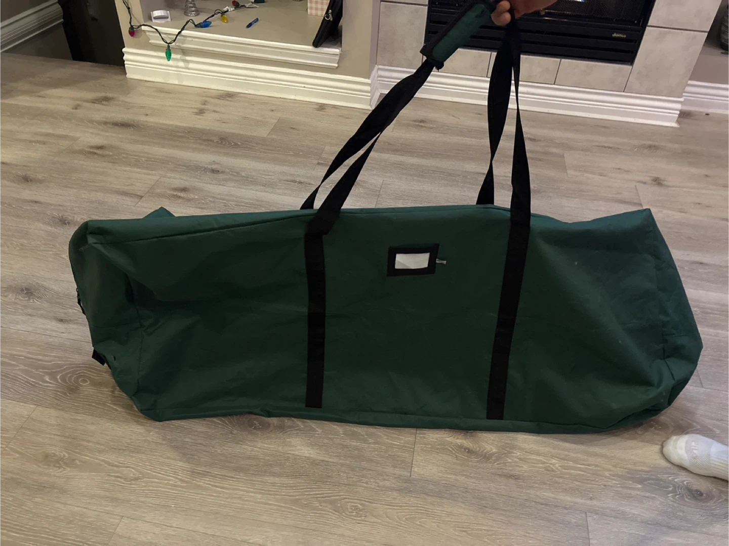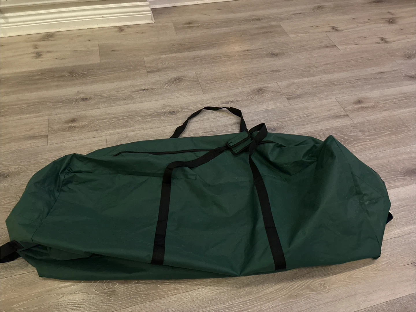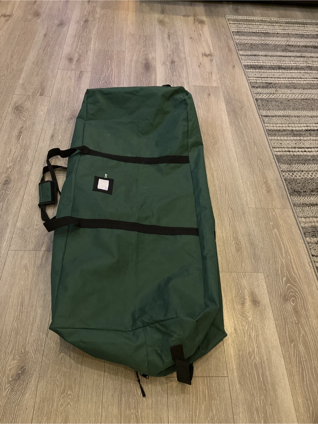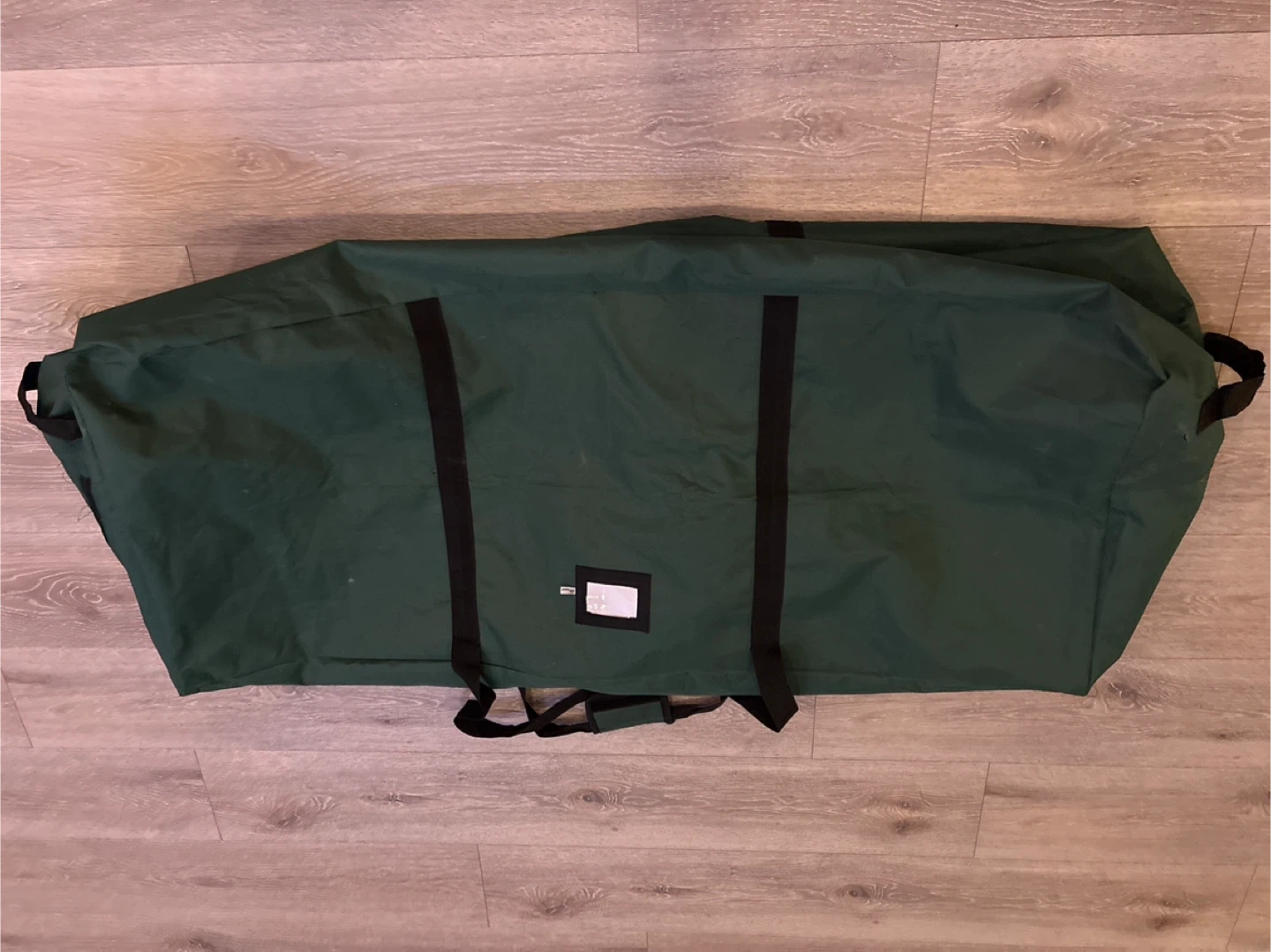Here's a handy green storage bag for your Christmas tree! It's in great shape and ready to help you pack away your tree after the holidays. It has black straps for easy carrying