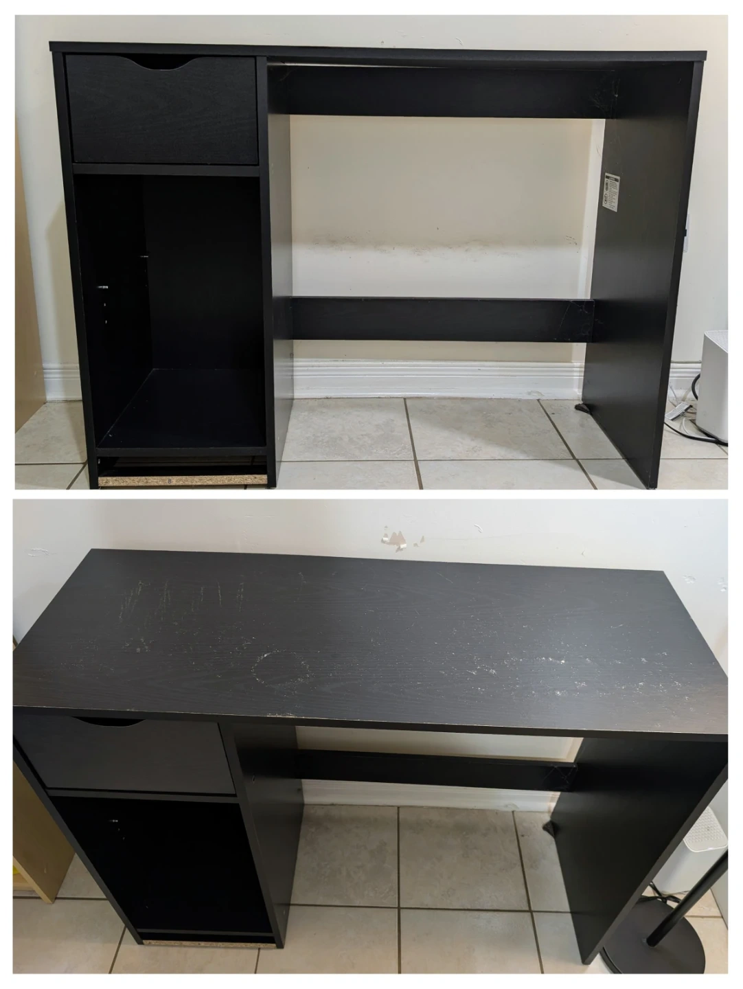 Selling a black desk that comes with a drawer and open shelving on one side! It's perfect for a home office or student. There are some signs of use on the top surface.