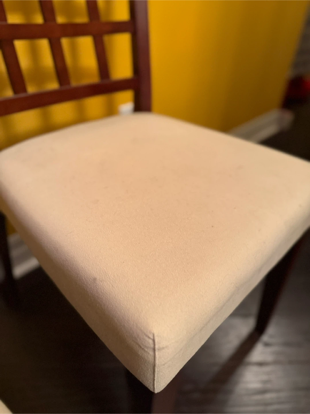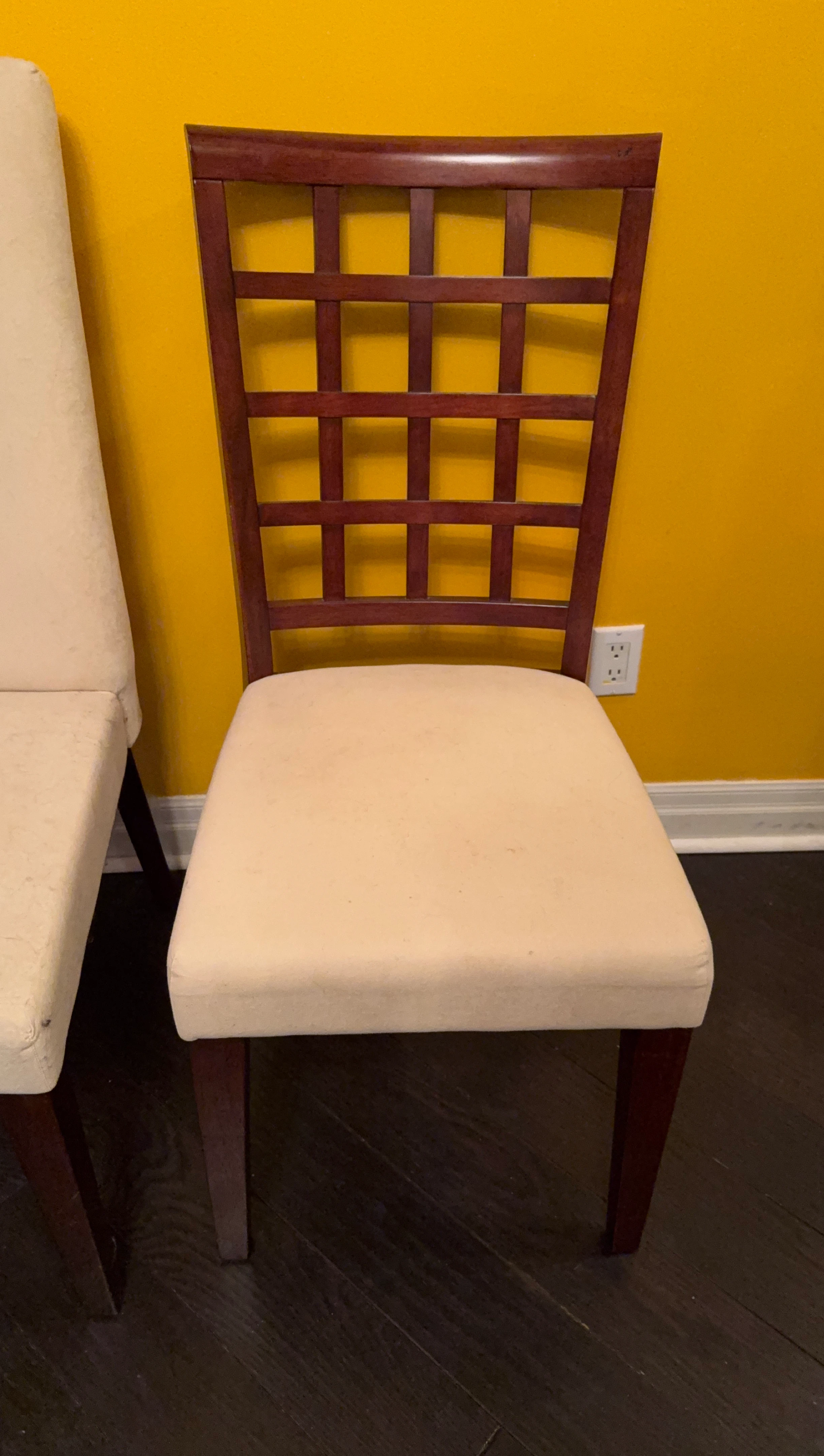 Selling 2 gently used dining room chairs! They feature sturdy wood frames and a comfortable plush beige seat. Perfect for adding a touch of elegance to your dining space.