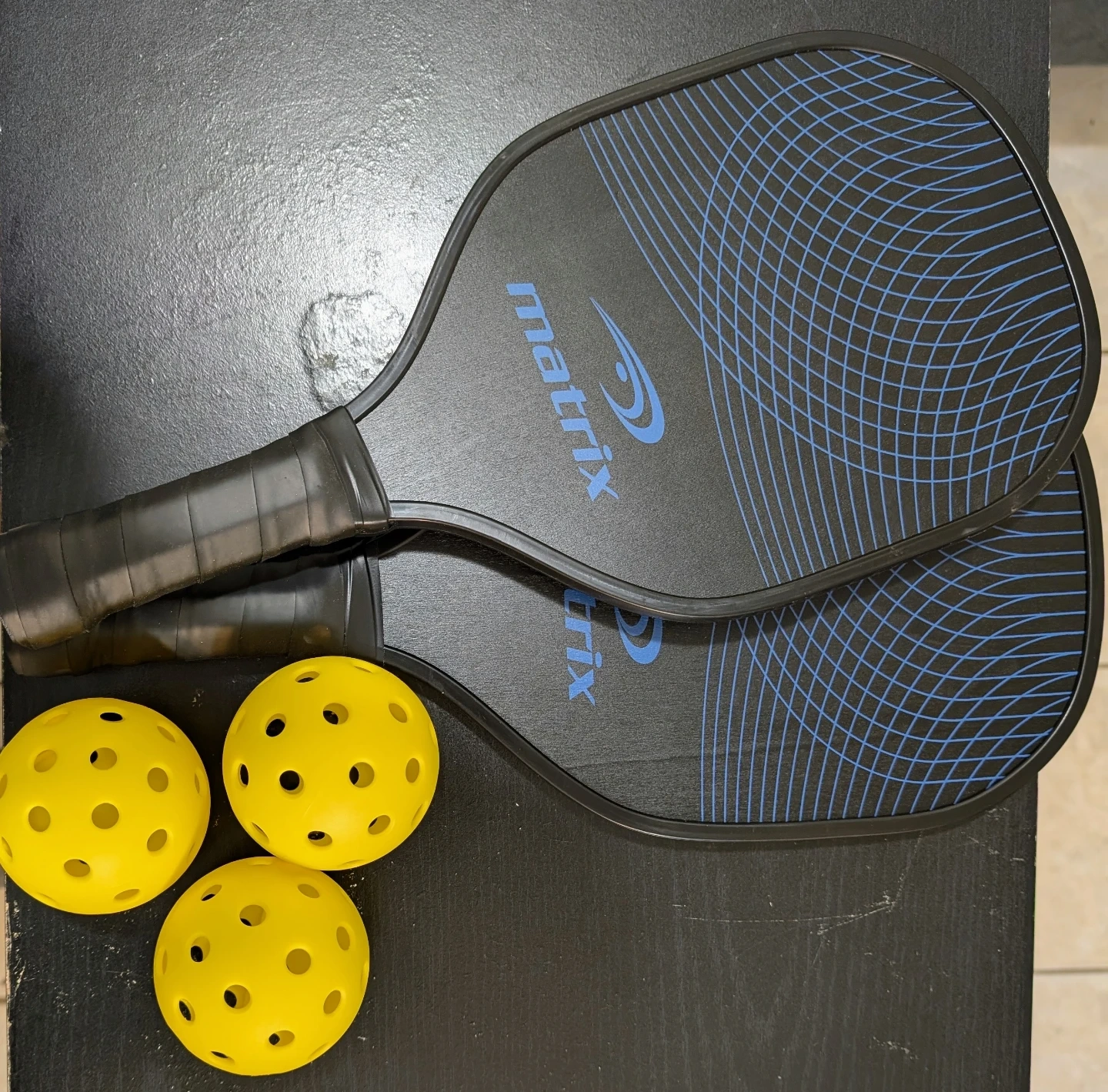 Selling a set of two Matrix pickleball paddles, along with three yellow pickleballs! The paddles are black with a blue design. Great for getting into the sport or upgrading your current set