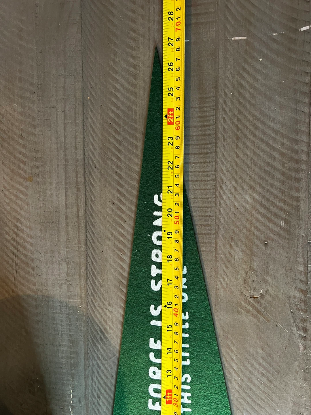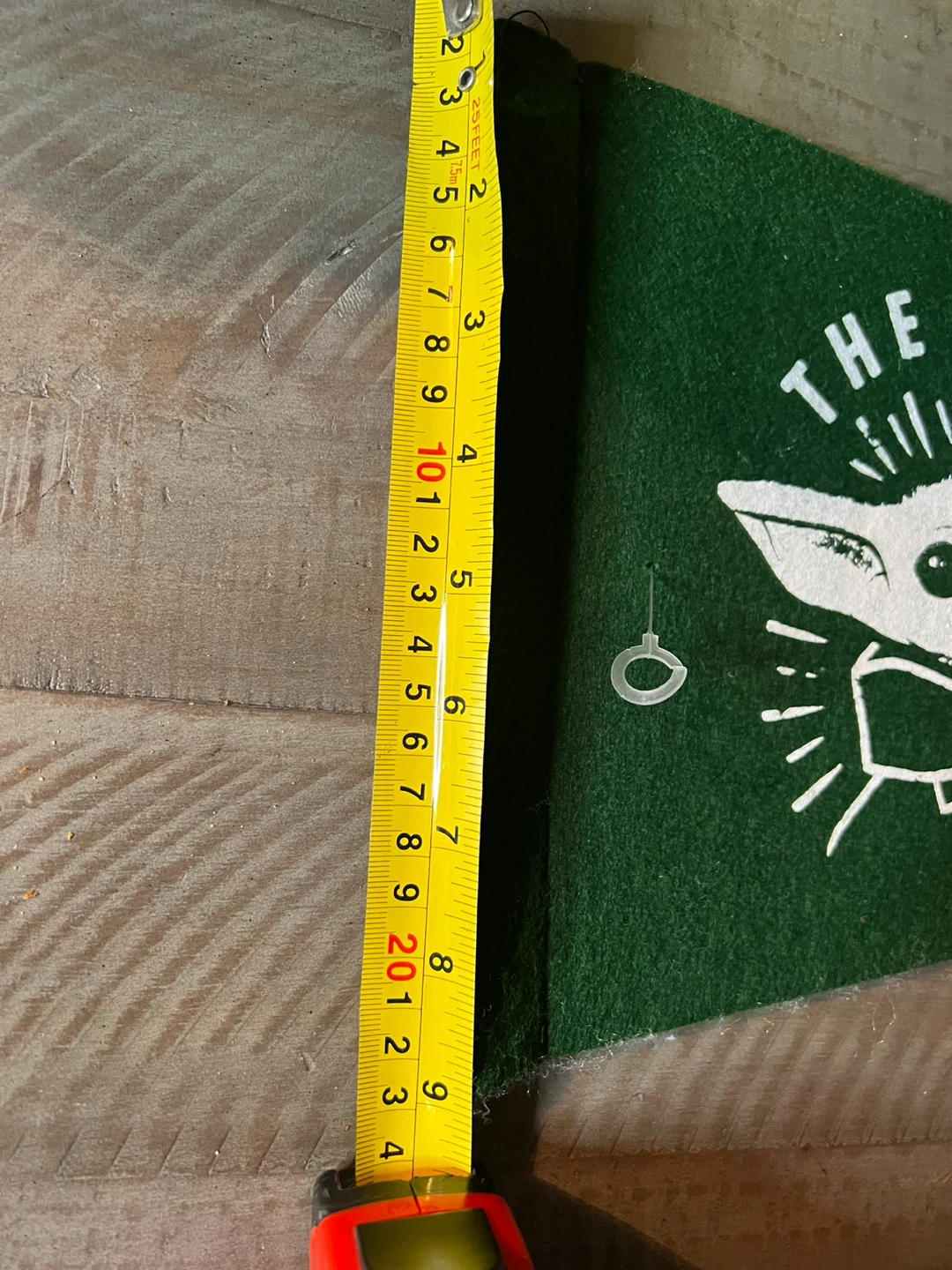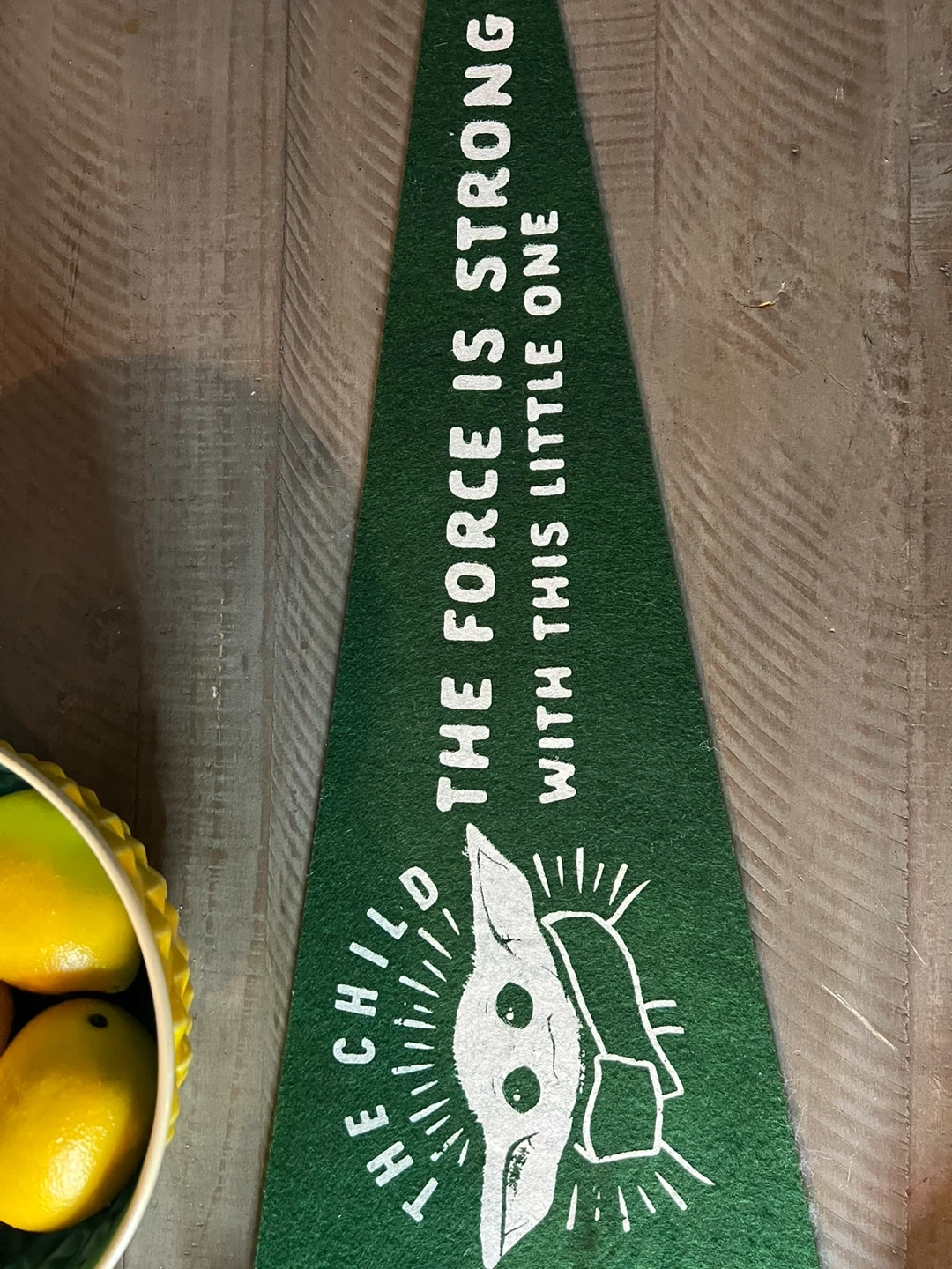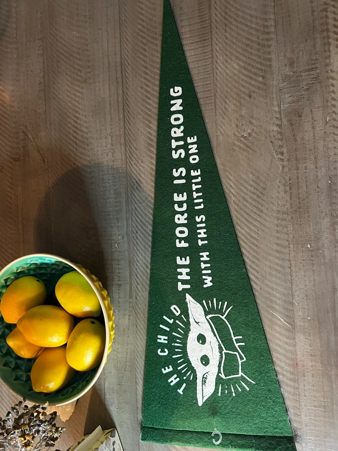 Here's a Star Wars "The Child" pennant flag! It's green and features the iconic image of Grogu, aka Baby Yoda. The pennant reads, "The Force is Strong with this Little One." It's a fun piece of Star Wars memorabilia!